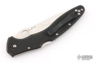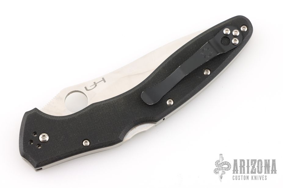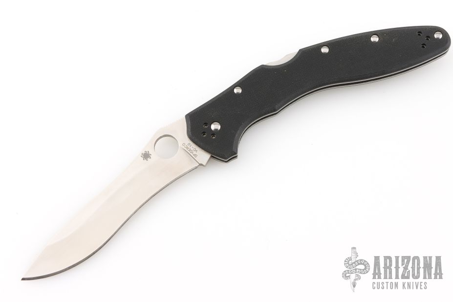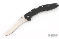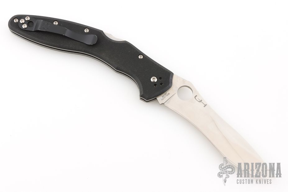 This Ulize from Spyderco features a satin finished recurve blade with thumbhole and notched thumbrest. The handle has black G-10 scales, stainless steel liners and backspacer, and a black 4-way reversible black coated stainless steel clip. Comes with original box and papers. Has some scuffs and scratches, great condition otherwise.