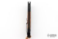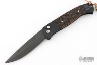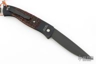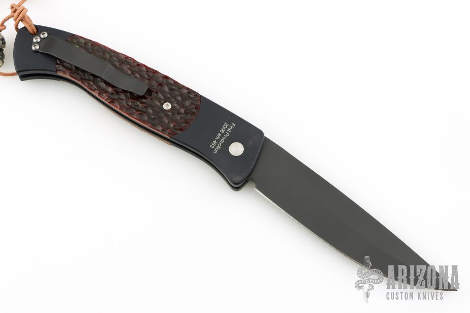 The Walter Brend designed/Pro-Tech collaboration - Brend Auto #1. It features a black coated drop point blade with false top edge. The handle is comprised of black anodized aluminium double bolsters and red jigged bone inlays over a black anodized frame. Black coated, tip up stainless steel clip and lanyard hole in pommel. Has a few light scuffs, otherwise excellent condition. First Production Run #463. Comes with a zippered case.