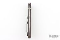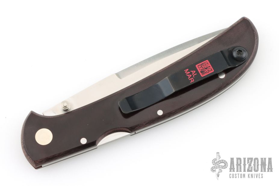 The Eagle Ultralight Talon by Al Mar features a satin finished VG-10 Core San Mai blade with false top edge and dual thumbstuds. The handle has burgundy linen micarta scales and stainless steel backspacer, tip up black stainless steel clip. Excellent condition.