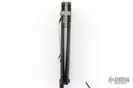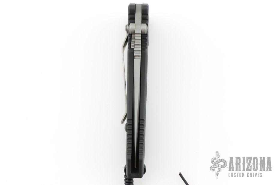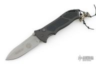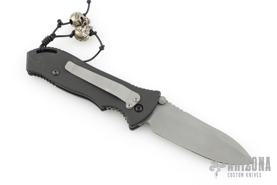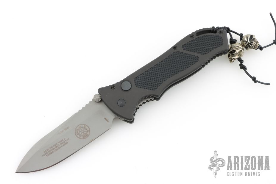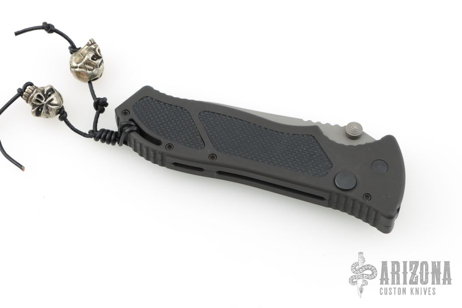 This Point Man Auto from Masters of Defense features a bead blasted spear point blade with swedge, notched thumbrest, dual thumbstuds and partially serrated edge. The handle has a black anodized aluminum with non-slip inlays on the "A" side over an inlaid steel lockbar. Stainless steel tip down clip. Lanyard hole in pommel. Has some scuffs, otherwise excellent condition.