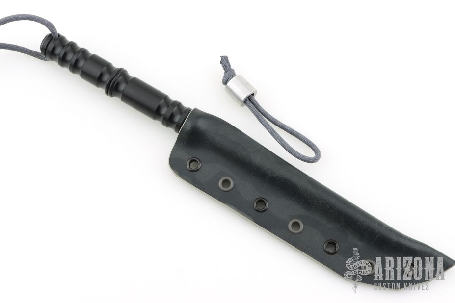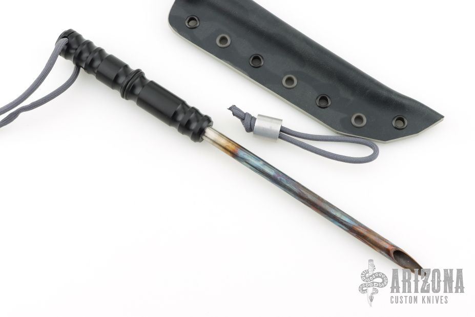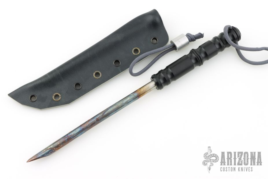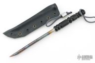Core Sampler 4.5" Delrin handle, 304 Stainless steel .375"x6.375" long carved and heat ano, kydex skeath. Lanyard bead 7075 Aluminum recycled aircraft part.