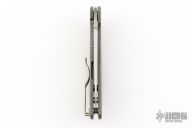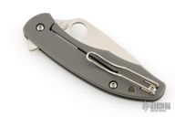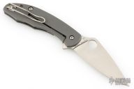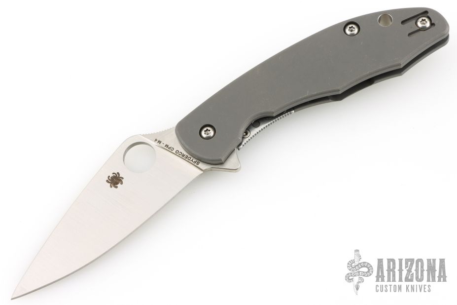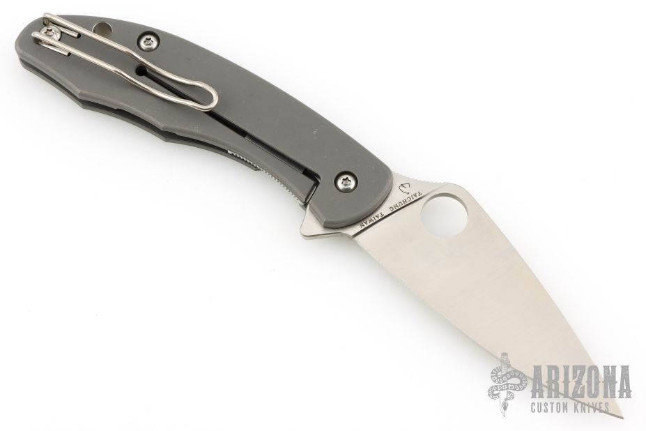 This Mantra Pln by Spyderco features a satin finished blade with notched thumbrest, thumbhole, and flipper. The handle has a tumbled titanium frame with paper clip style clip, tip up reversible, stainless lockbar insert, lanyard hole with beaded lanyard. New condition. Comes with original box and papers.