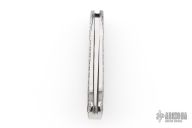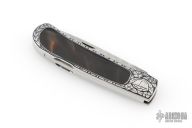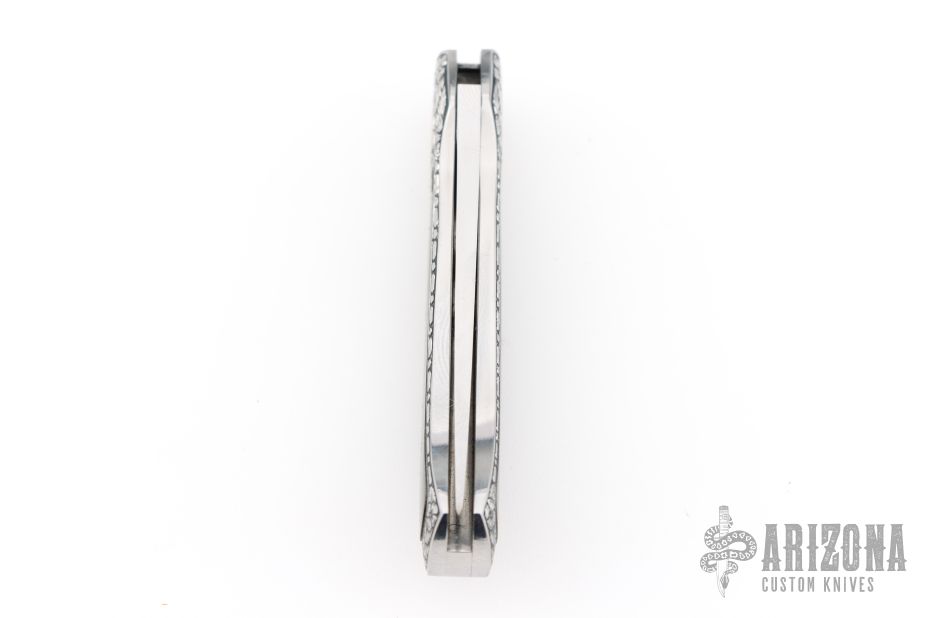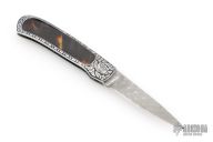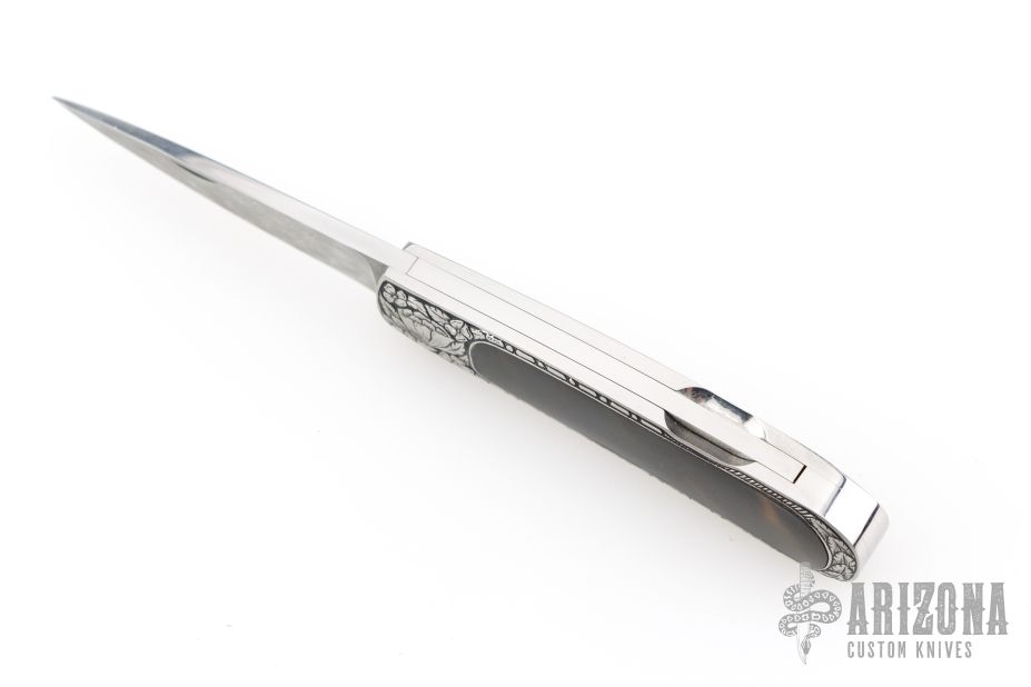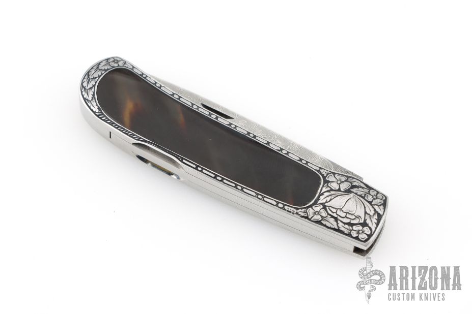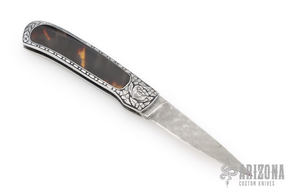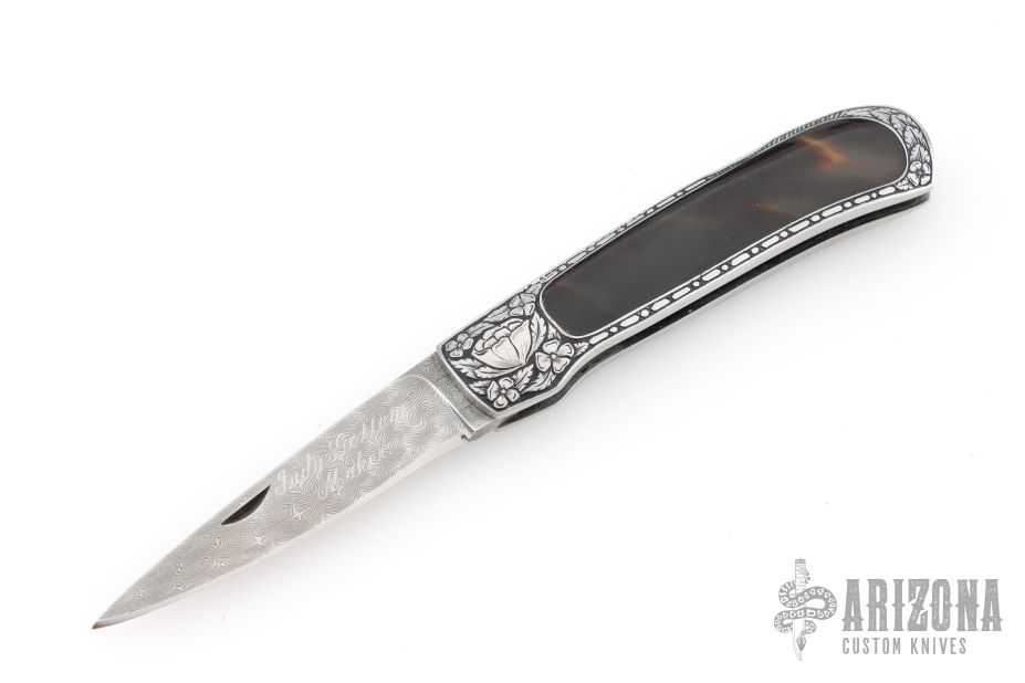 This interframe lockback by Judy Gottage features a Damascus blade with nail nick, it is marked "Judy Gottage Maker" on the blade. The handle has an engraved stainless steel frame, tortoise inlays, and a stainless steel backspacer. The handle has no exposed hardware. Has some light scratches otherwise excellent condition. Judy's knives don't come up for sale very often. Comes with a felt pouch.