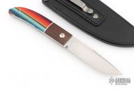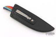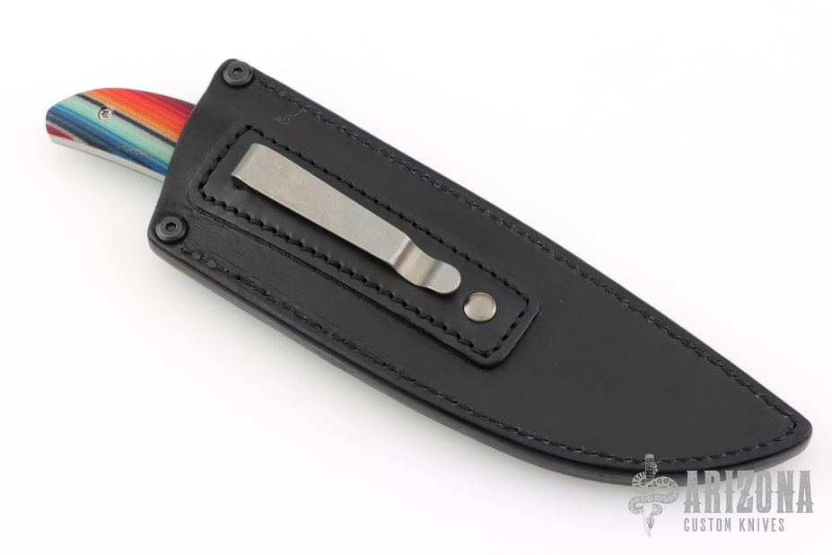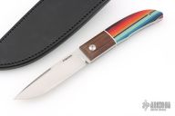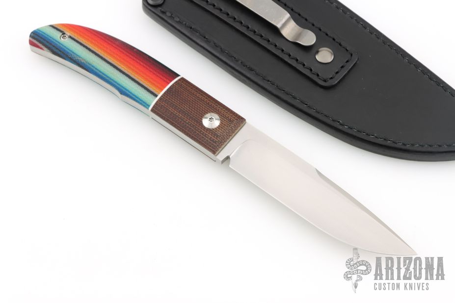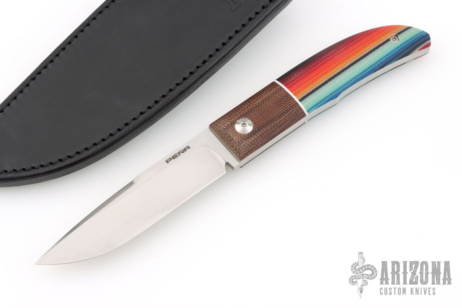 This Custom Fixed Blade by Enrique Pena features a hand rub satin finished blade with false top edge, .144" blade stock and .836" blade depth, full tang construction. The handle has brown canvas micarta and G-10 scales.  Comes with a black leather sheath and box.  New from maker!