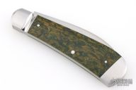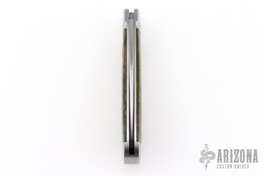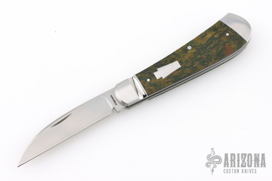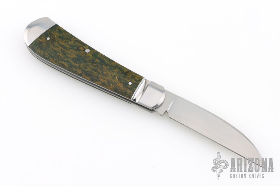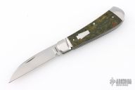 This Swayback by Enrique Pena features a hand rubbed satin finish and nail nick. The handle has a fluted stainless steel bolsters and escutcheon, green rag micarta covers, stainless steel liners and spring. Half stop on blade, flush in all positions. Includes a padded zippered case.  New from maker!