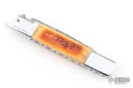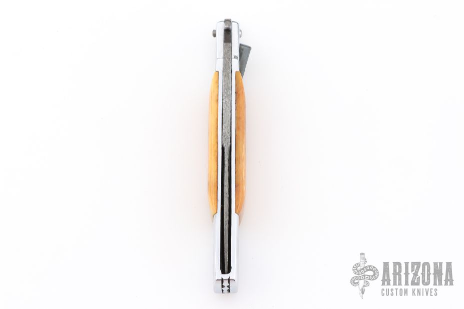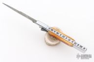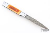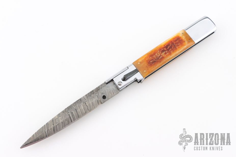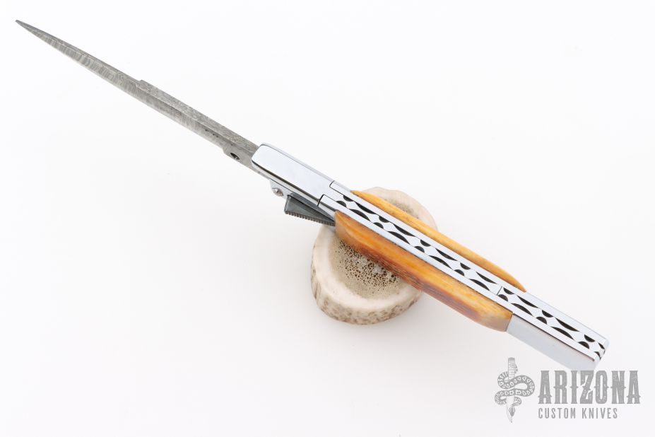 This Picklock Auto by Agasi Hambartsumian of Armenian Doctor Knives features a Damascus bayonet ground blade with a false top edge. The handle has a polished stainless steel frame with fileworked stainless steel backspacer, jigged bone scales with brass pins. New from maker.