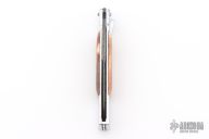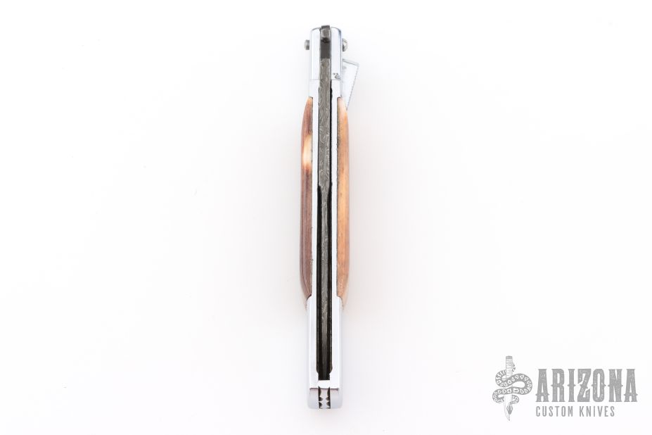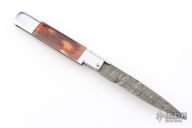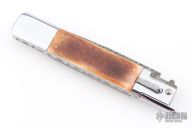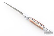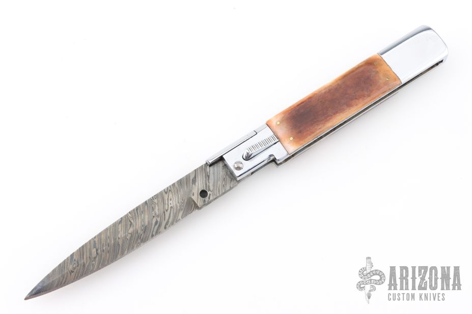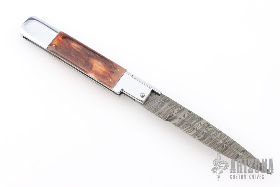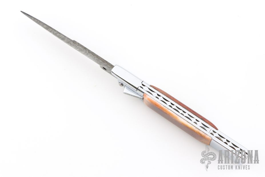 This Picklock Auto by Agasi Hambartsumian of Armenian Doctor Knives features a Damascus bayonet ground blade with a false top edge. The handle has a polished stainless steel frame with fileworked stainless steel backspacer, bone scales with brass pins. New from maker.