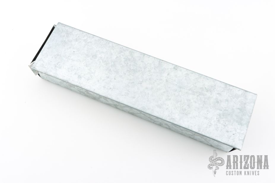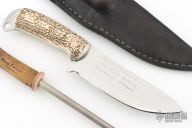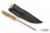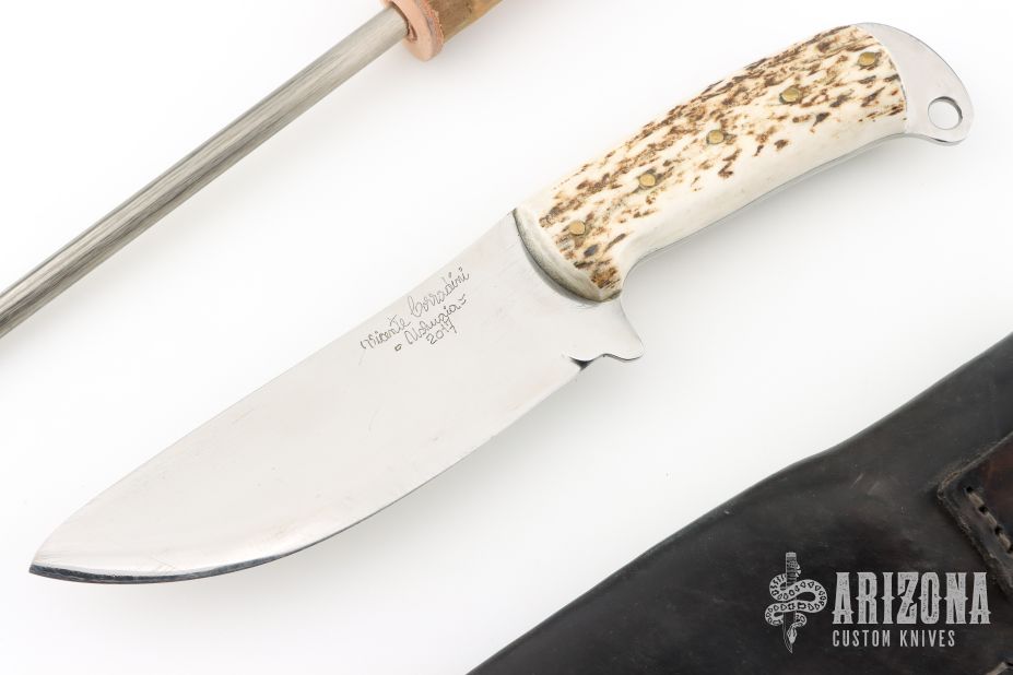 This knife by Vicente Corradinin features a mirror polished blade with .115" blade stock and 1.820" blade depth, full tang construction. The handle has stag scales, brass pins, lanyard hole at the butt. Comes with a black leather sheath. Comes with a custom made metal box. Also comes with a custom sharpening steel with wood handle also made by the maker. The knife has some light scratches, otherwise excellent condition. The b-side of the blade reads "Paul Challis Muchas Gracias Soledad - Gerard"