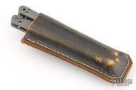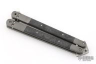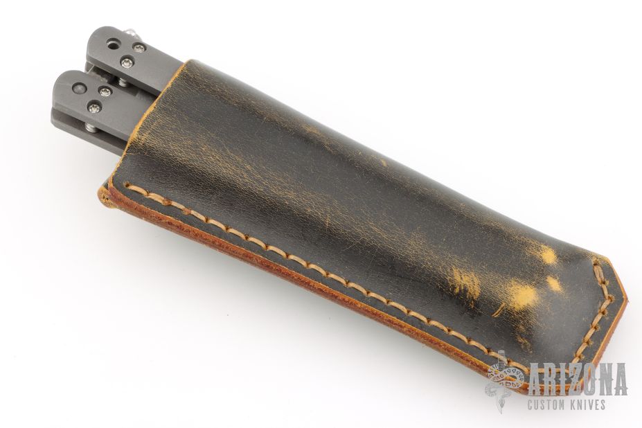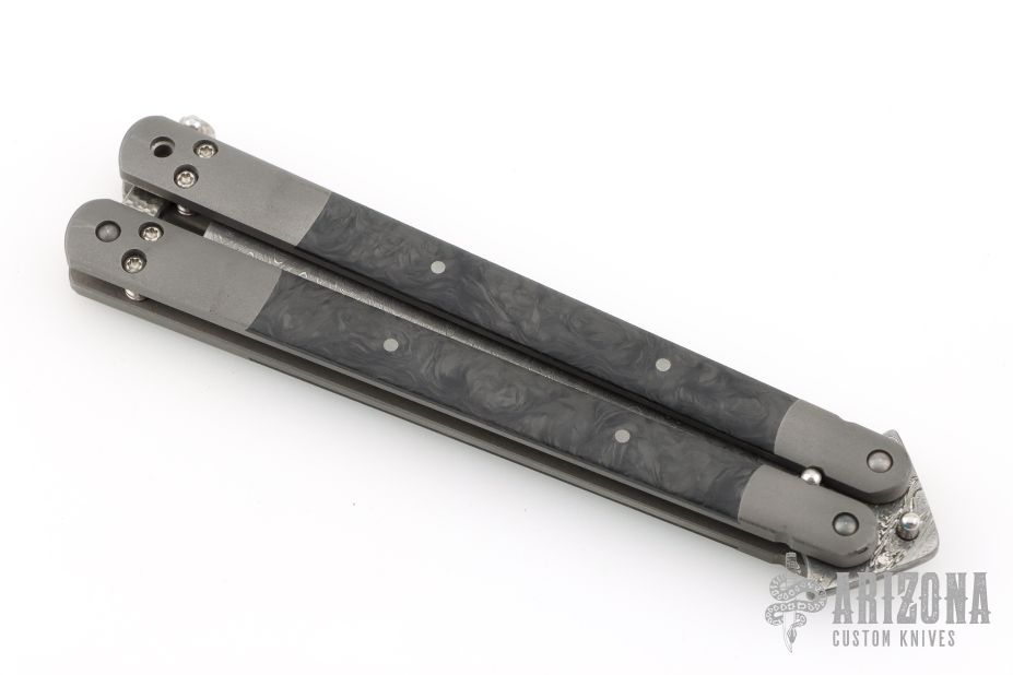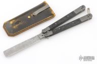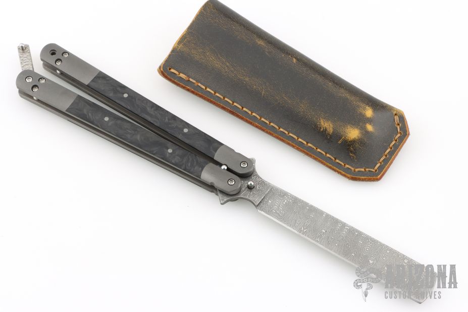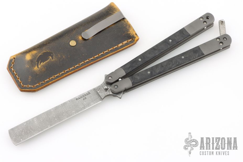 This Balisong by Journeyman Smith Craig Camerer features a Damascus razor style blade. The handles have dovetailed and bead blasted titanium bolsters and integral liners, marble carbon fiber scales, titanium spacers, titanium T-latch. Comes with a zippered case and a brown leather pocket sheath. Has a few light scuffs, otherwise excellent condition.
