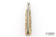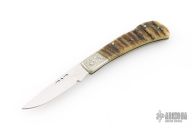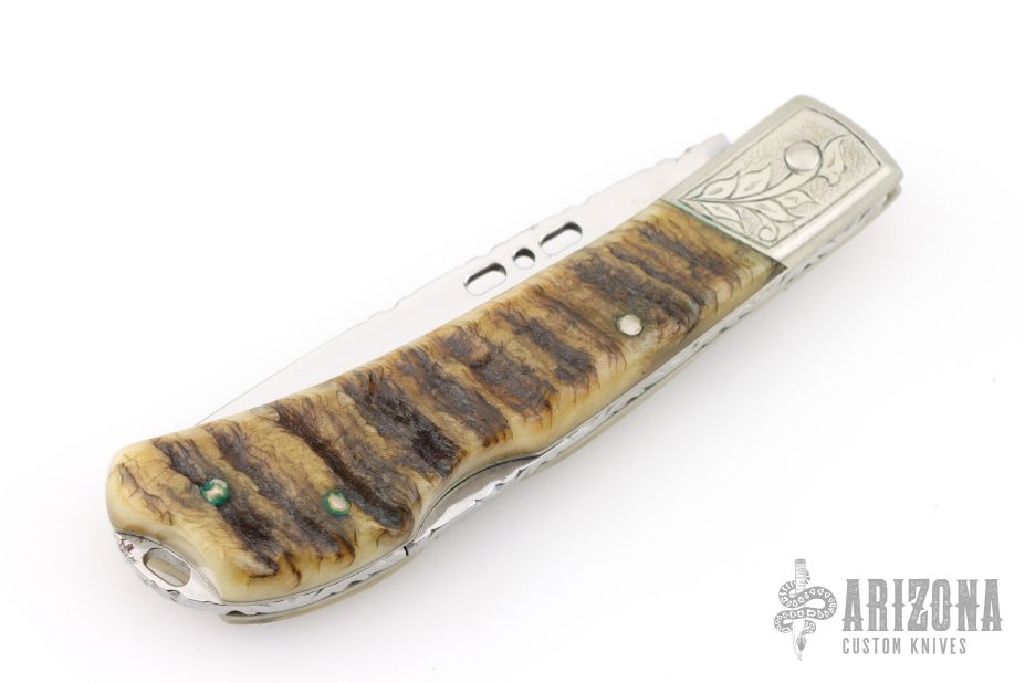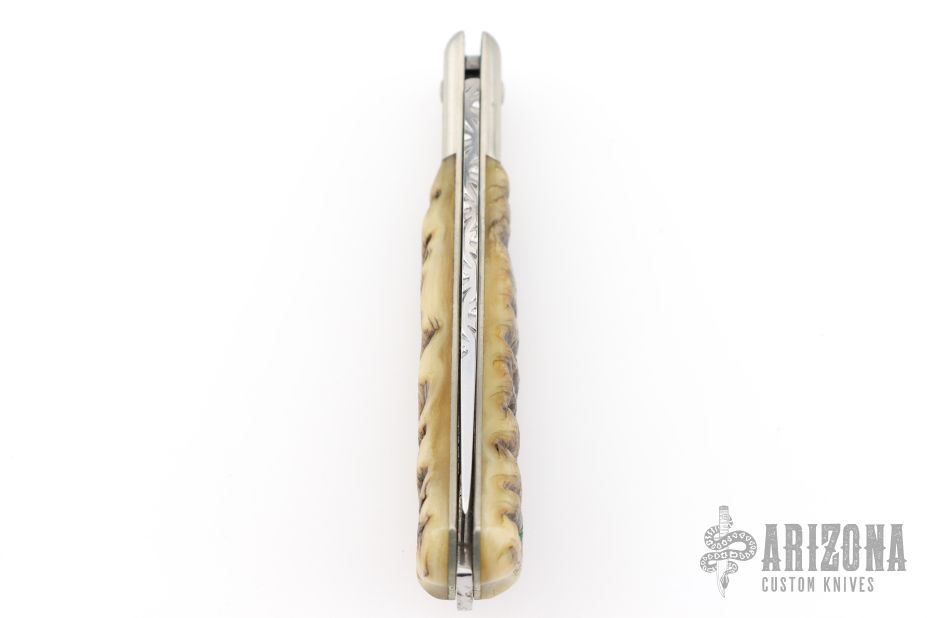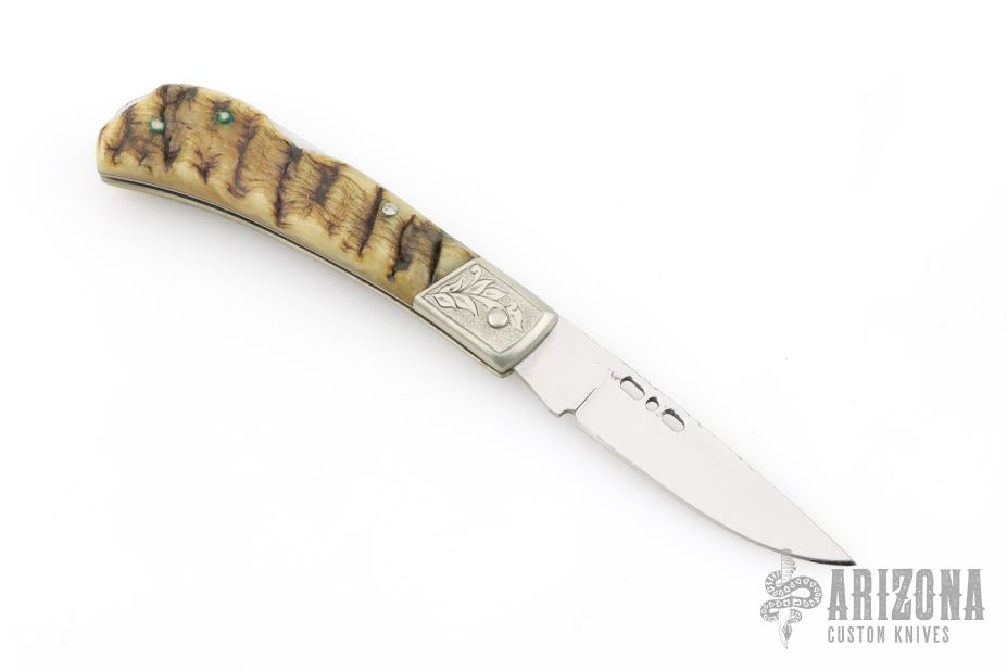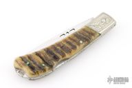 This lockback by Whiskers Allen features a high polish ATS-34 blade, floral engraving on the bolsters by Whiskers himself, and ram horn scales. Extensive filework on the blade spine, liners and backspacer. Cord lanyard with skull bead. Includes a padded zippered case.  Excellent Condition.