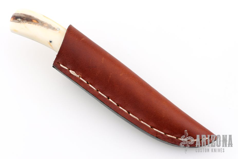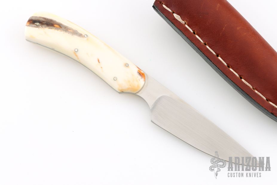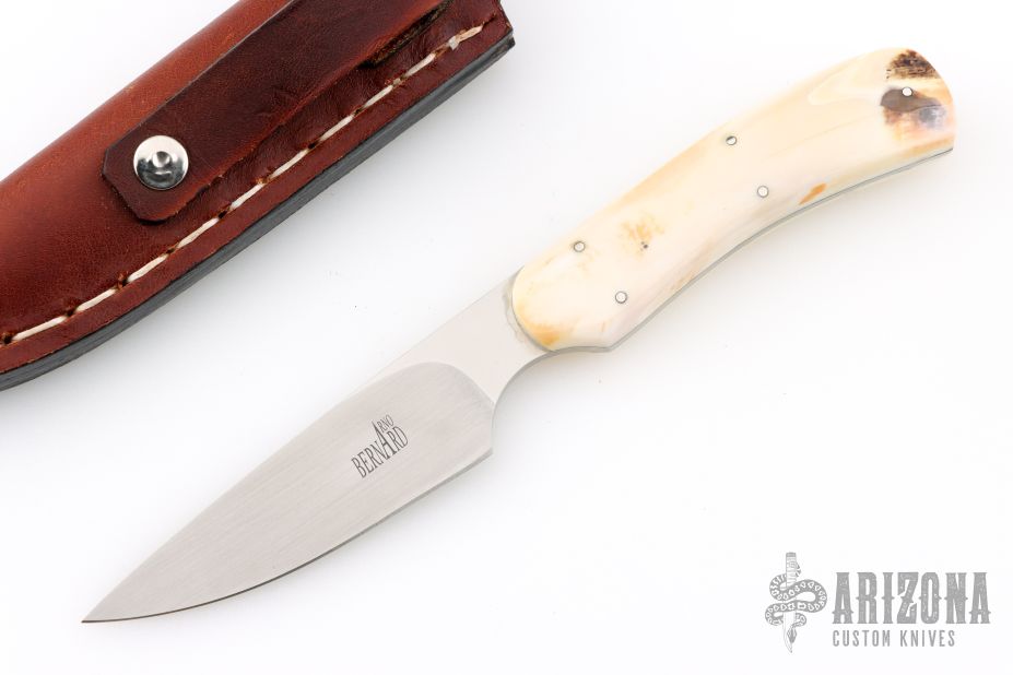 This "Jackal" by Arno Bernard is part of the "Scavenger" series of knives. This piece has warthog tusk handle scales. Hand rubbed satin finish N690 blade with .116" blade stock and .895" blade depth, full tang construction. Includes a brown leather sheath. Excellent condition.
