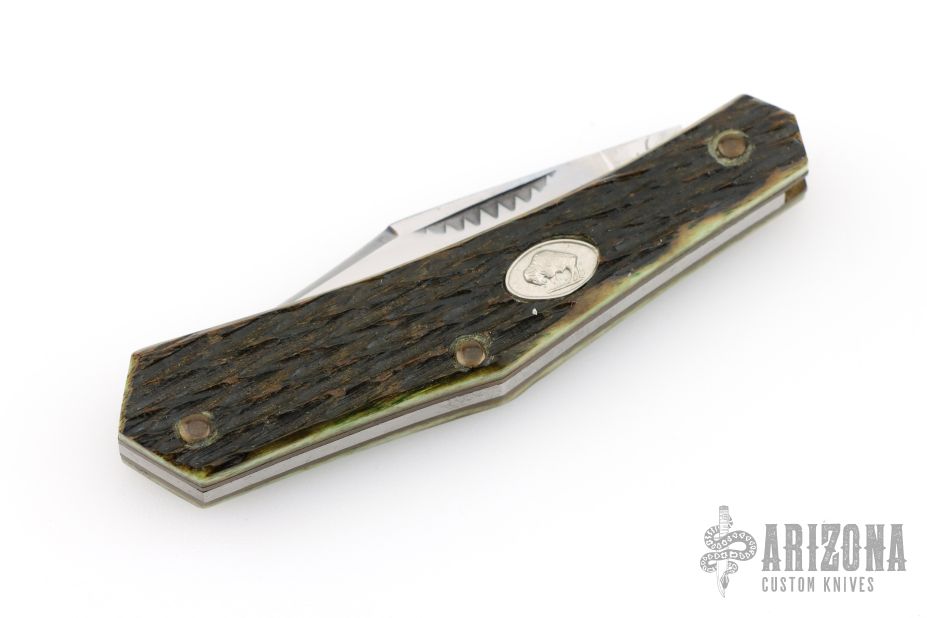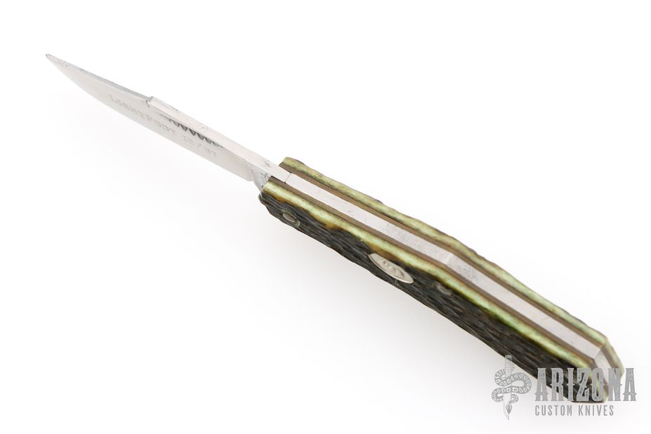 This slipjoint by Cripple Creek has a satin finished clip point blade with a single nail nick.  The handle has jigged bone covers over brass liners and a steel backspring.  Includes a padded zippered case.  Has some scuffs/scratches otherwise the knife is in excellent condition.