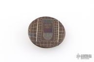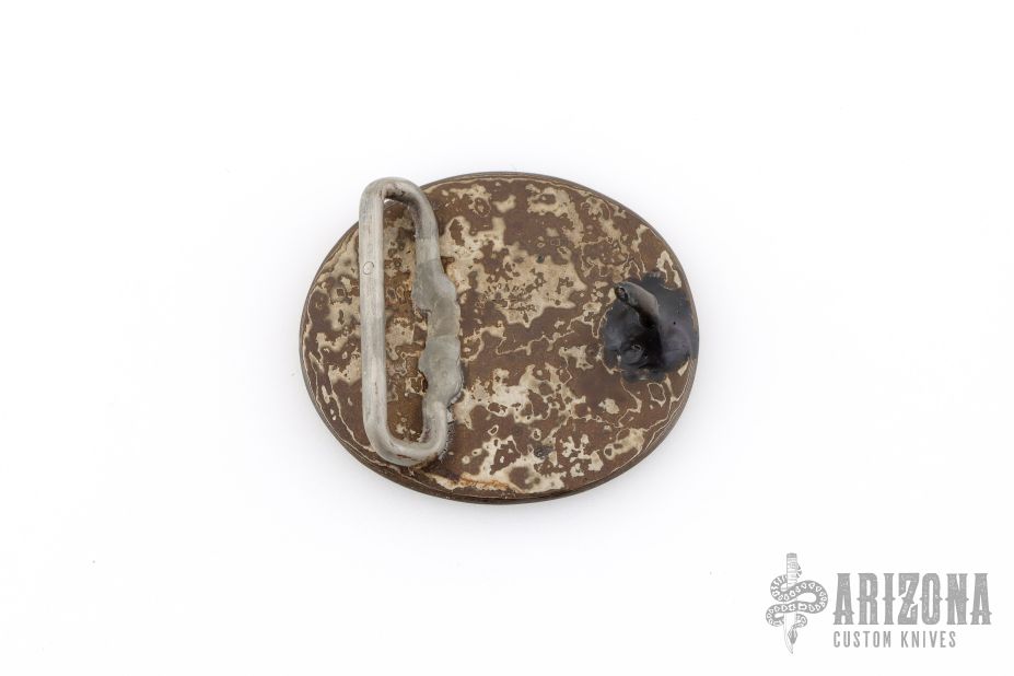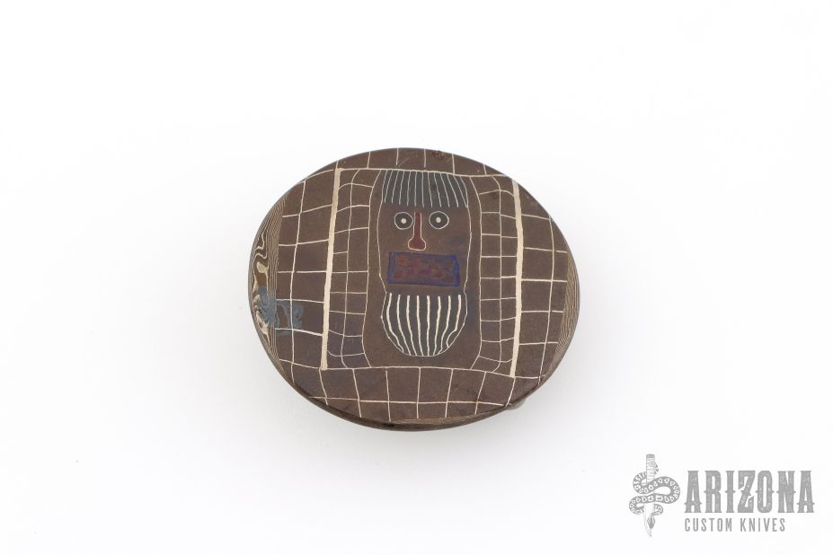 This belt buckle by Steve Schwarzer is made of picture mosaic Damascus and has the face of a man with a beard that I can only assume is of himself. It is an oval that is approximately 1.875" tall and 2.125" wide. Has a loop for a 1.25" wide belt. One of a kind. Excellent condition.