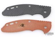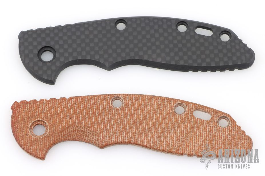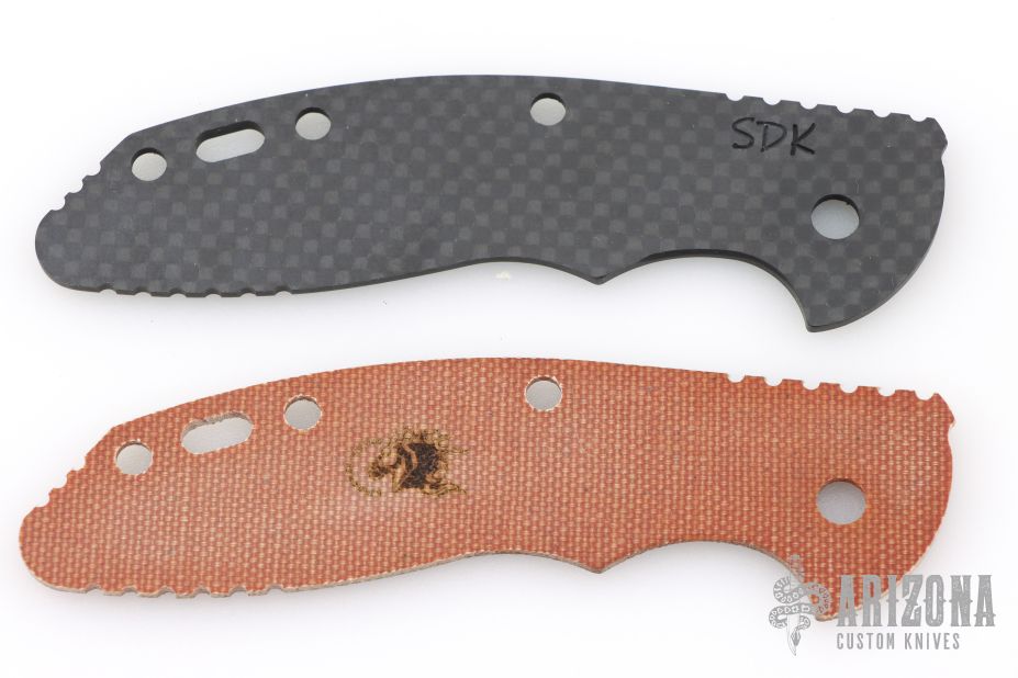 2 Scales for a Hinderer XM-18 3.5". One is an OEM Hinderer brown micarta scale, and the other is a Sharp Dressed Knives carbon fiber scale. Excellent condition.