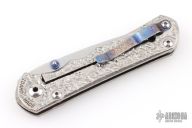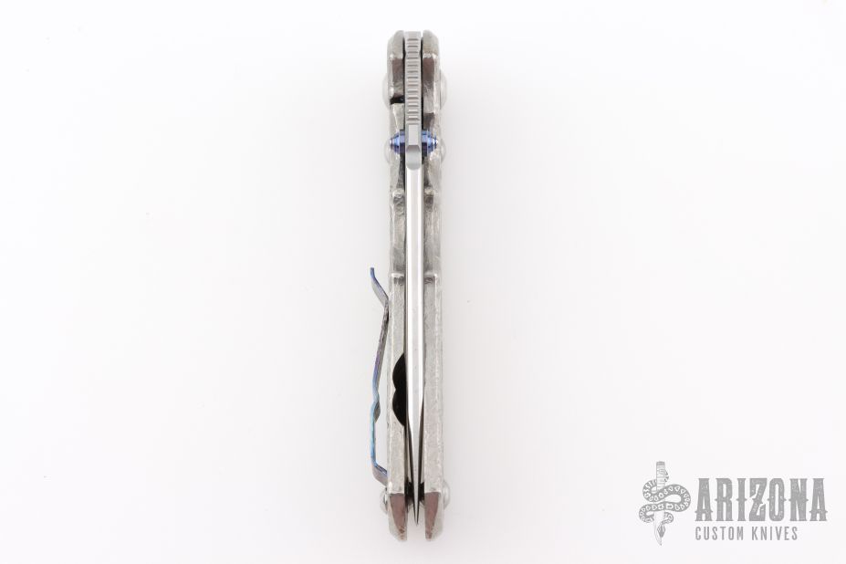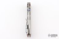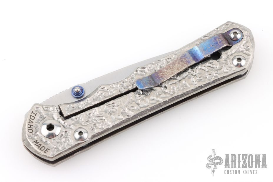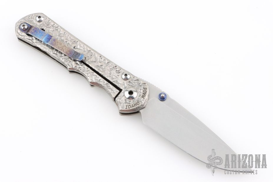 This Large Inkosi from Chris Reeve features a tumble finish blade with dual thumb-studs and a carved/textured/polished titanium frame. Anodized and textured titanium clip, tip up carry.  Comes with original box, papers, and COA dated Jan 12, 2022. Nice detent, and blade seating. Has a couple light scuffs and scratches, great overall condition.