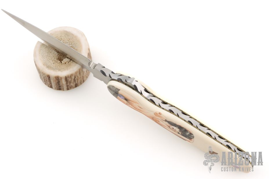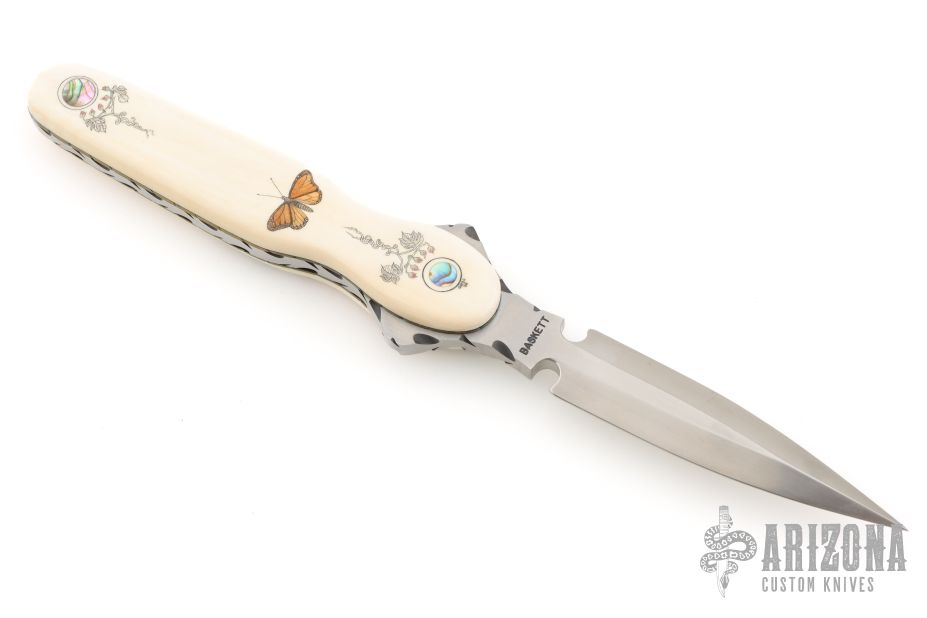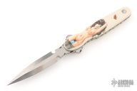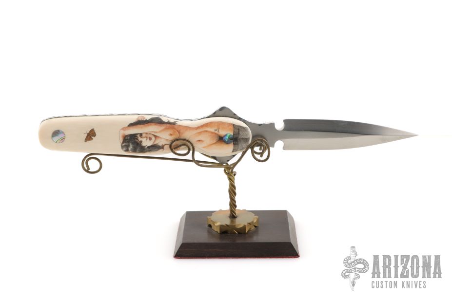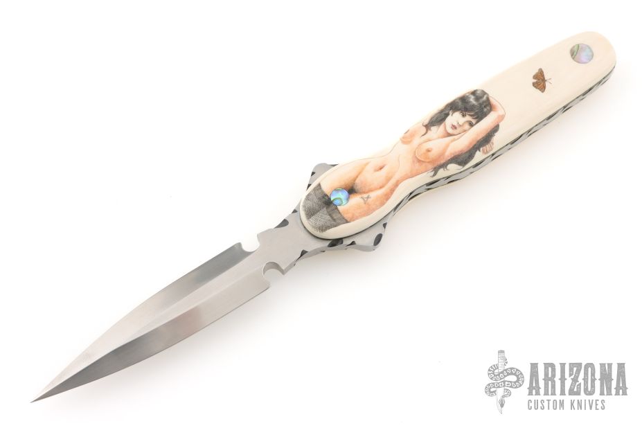 This Art dagger by Gene Baskett features a hand rub satin finished blade with unsharpened edges, fileworked spine and tang, .229" blade stock and .785" blade depth, full tapered tang construction. The handle has mamoth ivory scales with scrimshaw of a naked lady by Garbo dated 1988. The handle has has abalone inlays and fileworked brass liners. Excellent condition. The knife comes with a wood and brass display stand.