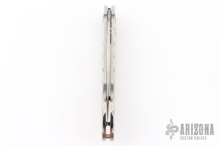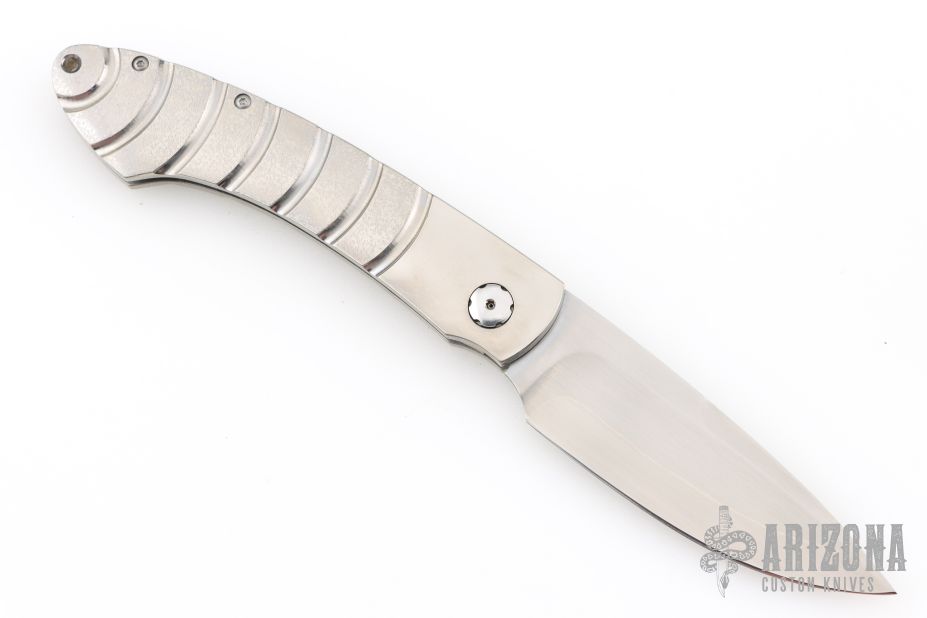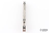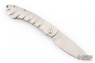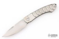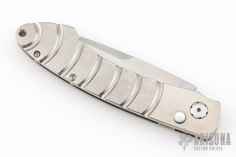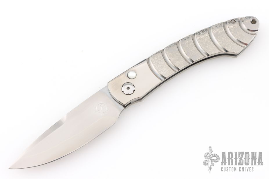This B12 auto by William Henry features a laminated ZDP-189 core stainless blade with a hand rub satin finish. The handle has a polished and stippled aerospace grade titanium handle. Black lip pearl inlaid button. Comes with original box, sheath and papers. COA dated June 16, 2006. Has some light scuffs and scratches, otherwise excellent condition. RARE