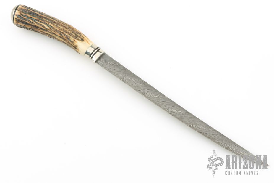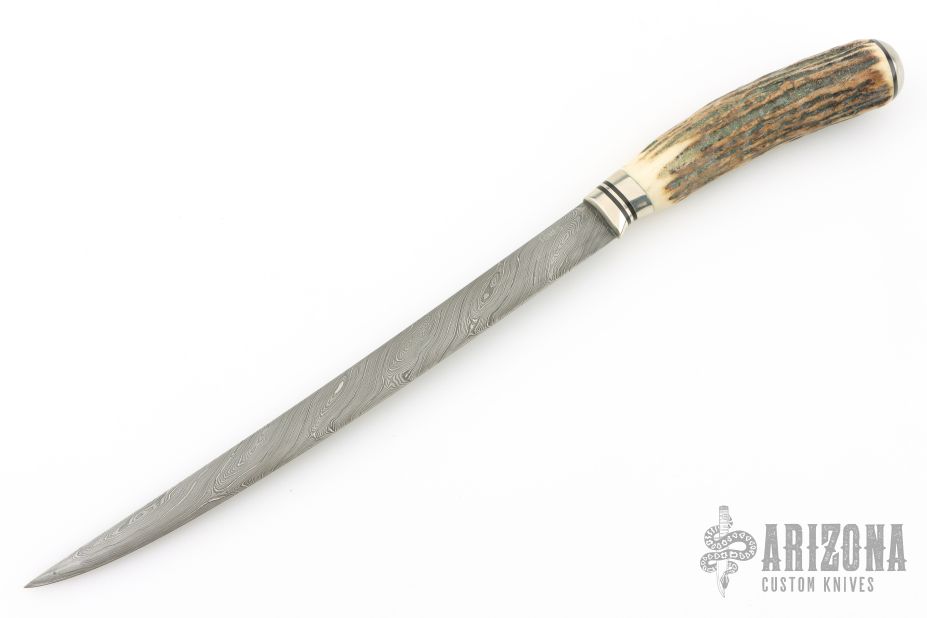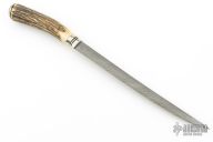This Carver by Master Smith PJ Tomes features a Damascus blade with .167" blade stock and .724" blade depth, hidden tang construction. The handle has a nickel silver guard with black spacers, and a stag grip. Excellent condition.
