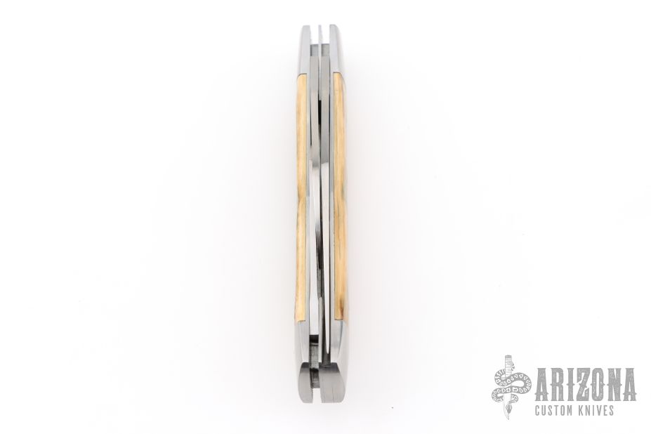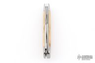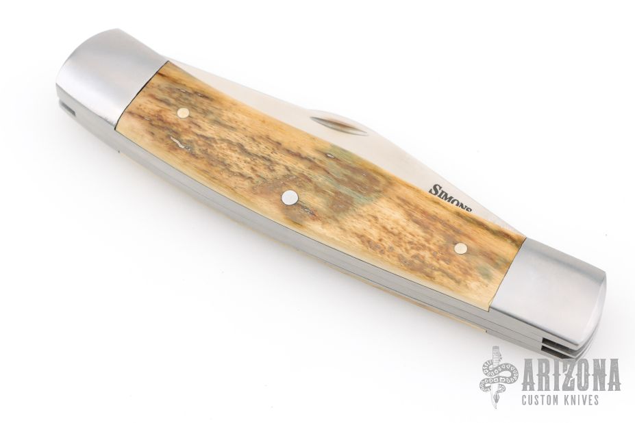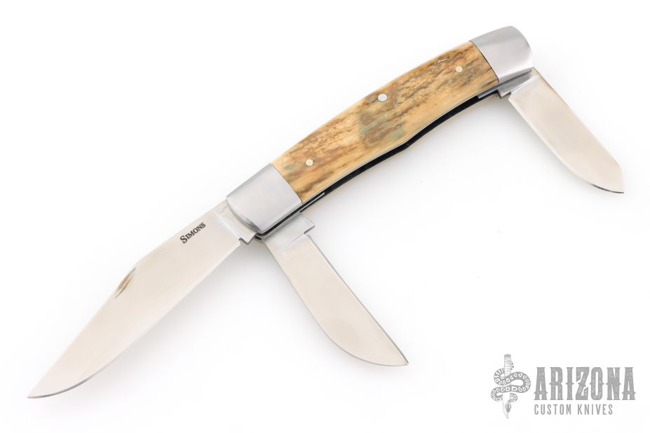 This slipjoint by Bill Simons features 3 satin finished blades with nail nicks. The handle has stainless steel bolsters front and rear, mammoth ivory covers, stainless steel springs, stainless steel liners. Has half-stops. #181. Comes with a zippered case.  Excellent Condition.