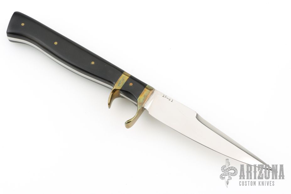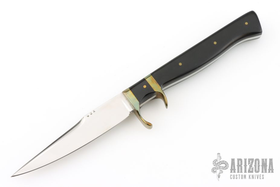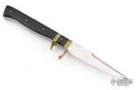 This Early Sub-Hilt Fighter by Colin Cox features a satin finished blade with sharpened top edge, .182" blade stock, .858" blade depth, full tang construction. The handle features a brass guard and sub-hilt, black paper micarta scales with brass pins. "12-81" on the blade. Has a couple very light scratches, otherwise excellent condition for its age.