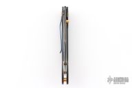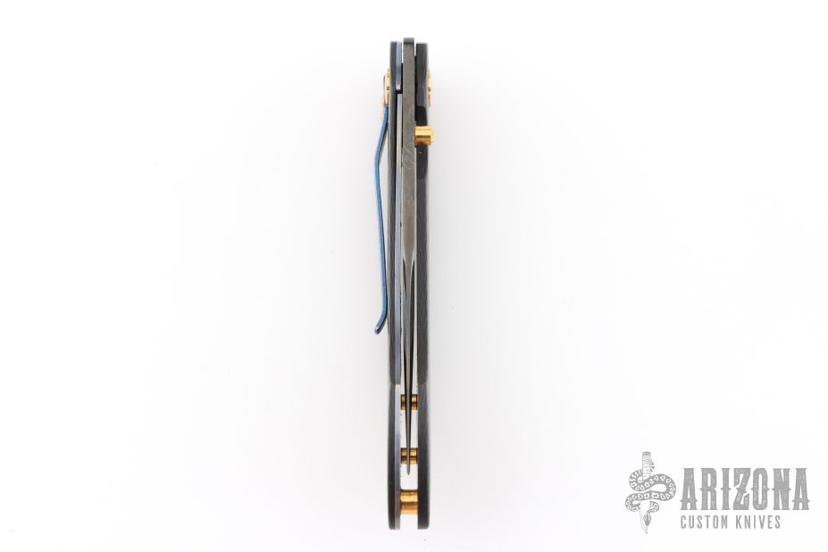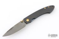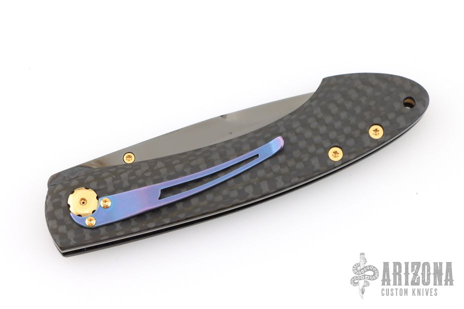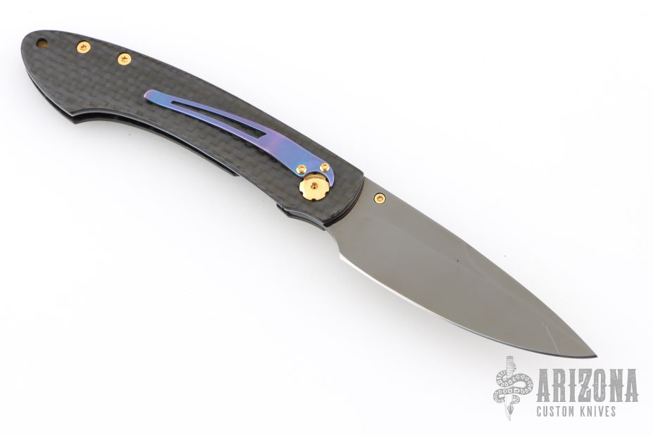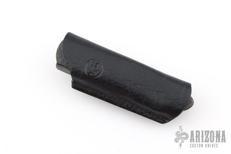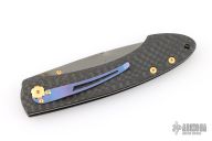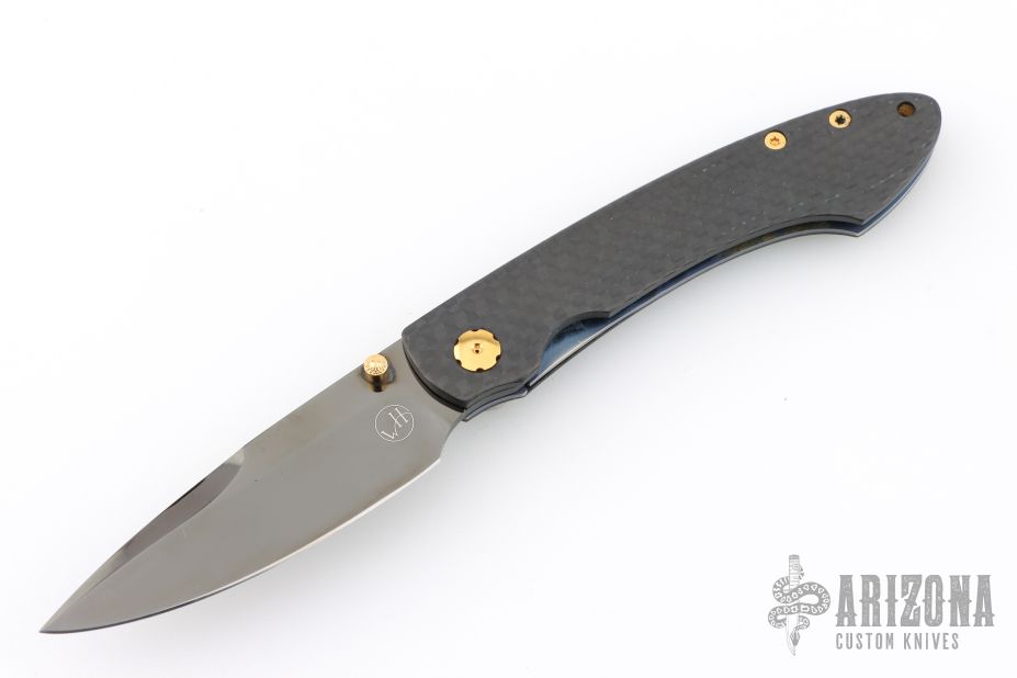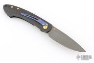This T12 CF Linerlock Folder by William Henry Fine Knives has a Boron Carbide coated spear point blade with false top edge and single thumb stud. Handle is carbon fiber with anodized titanium single liner (lock), barrel spacers, lanyard hole, and anodized titanium tip down clip. Comes in a WH box. Has scuffs and scratches, good condition otherwise.