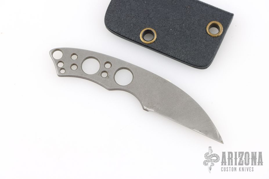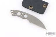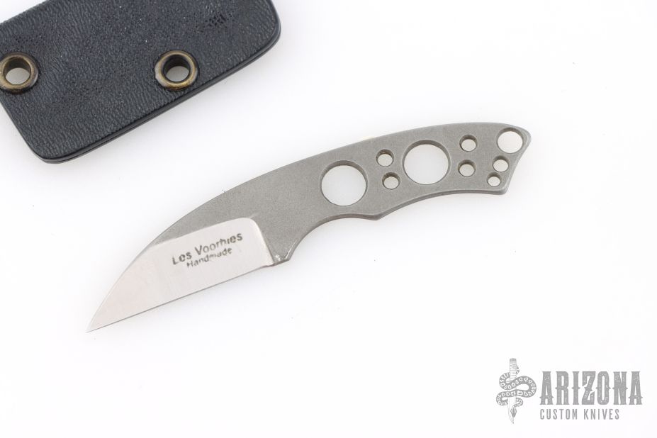 This neck knife by Les Voorhies features a chisel ground blade with a bead blasted finish, .059" blade stock and .6" blade depth, full tang construction. Comes with a kydex sheath and maker's card. Has some scuffs and scratches, great condition otherwise.
