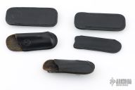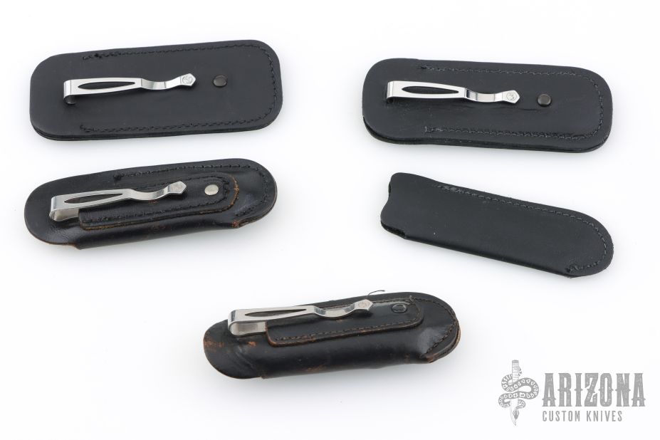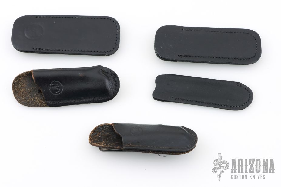 Five leather sheaths with clips: two larger, two smaller, and one with no clip. Excellent condition.