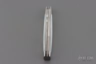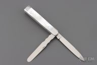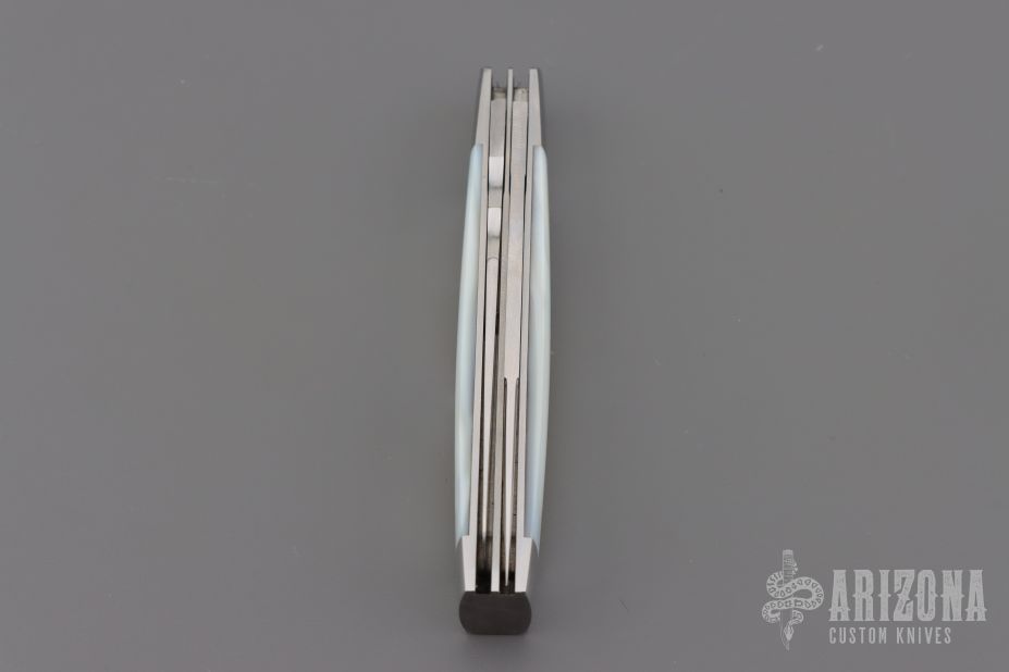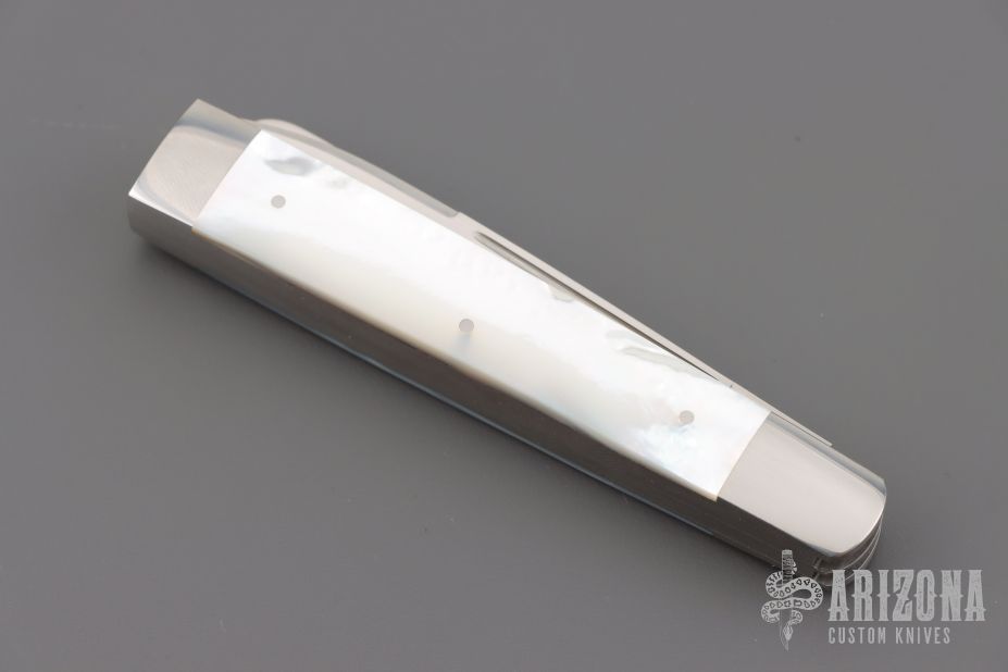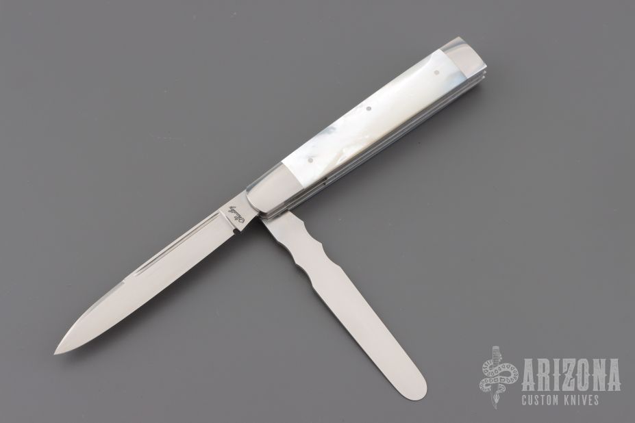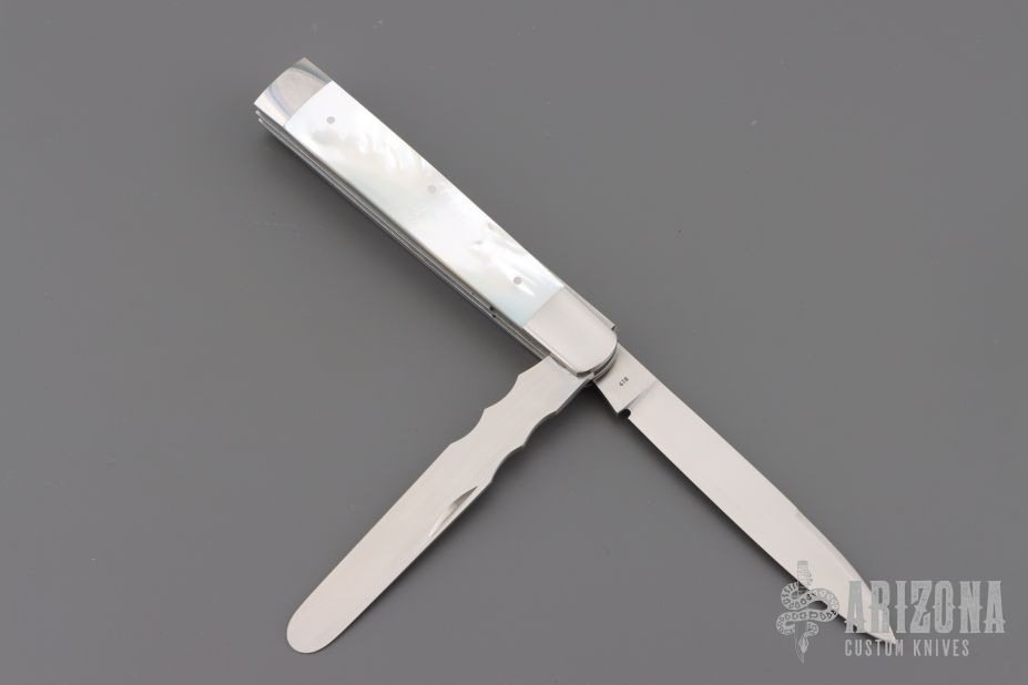This 2-Blade Doctor's Knife by Eugene Shadley features hand rub satin finished drop point blades with nail nick and longpull. One of the blades is a spatula. The handle has mirror finished stainless steel bolsters with mother-of-pearl covers, stainless steel pins, and stainless steel springs. Has half-stop, flush in all positions. Excellent Condition.