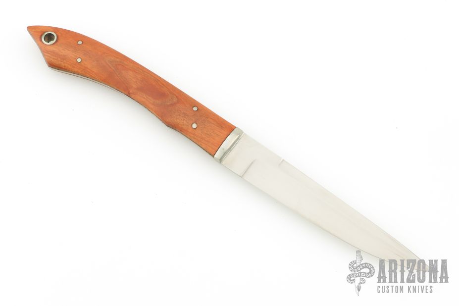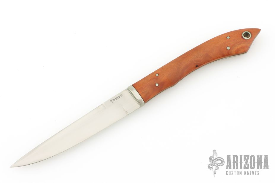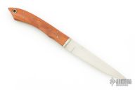This knife by P.J. Tomes features a hand rub satin finished blade with false top edge, .053" blade stock and .640" blade depth, full tang construction. The handle has a nickel silver guard and wood scales with nickel silver pins and lanyard hole. Excellent condition.