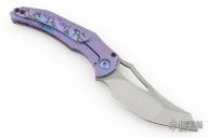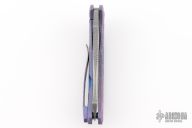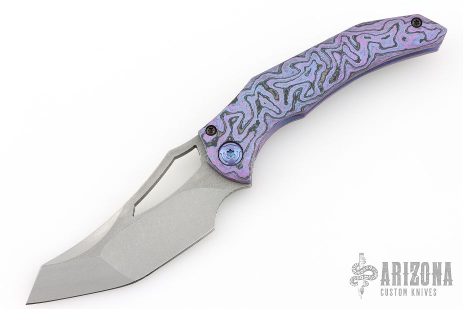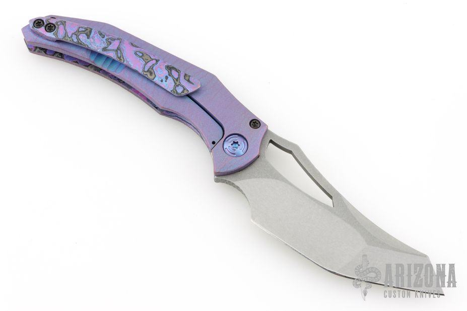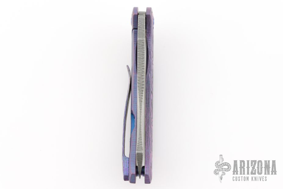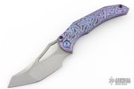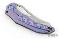 This knife by Gavko Knives features a multi-ground tumble finished blade with a large thumb hole. The frame is composed of bead blast and anodized titanium complemented by an anodized timascus show side and matching tip up pocket clip. Nice detent, lock up and blade seating. Includes maker's card. Excellent condition.