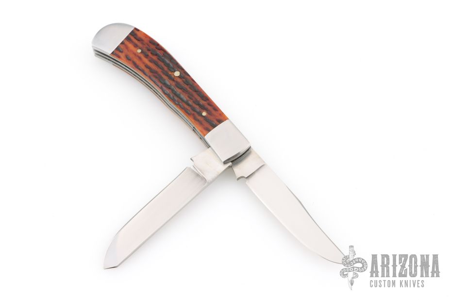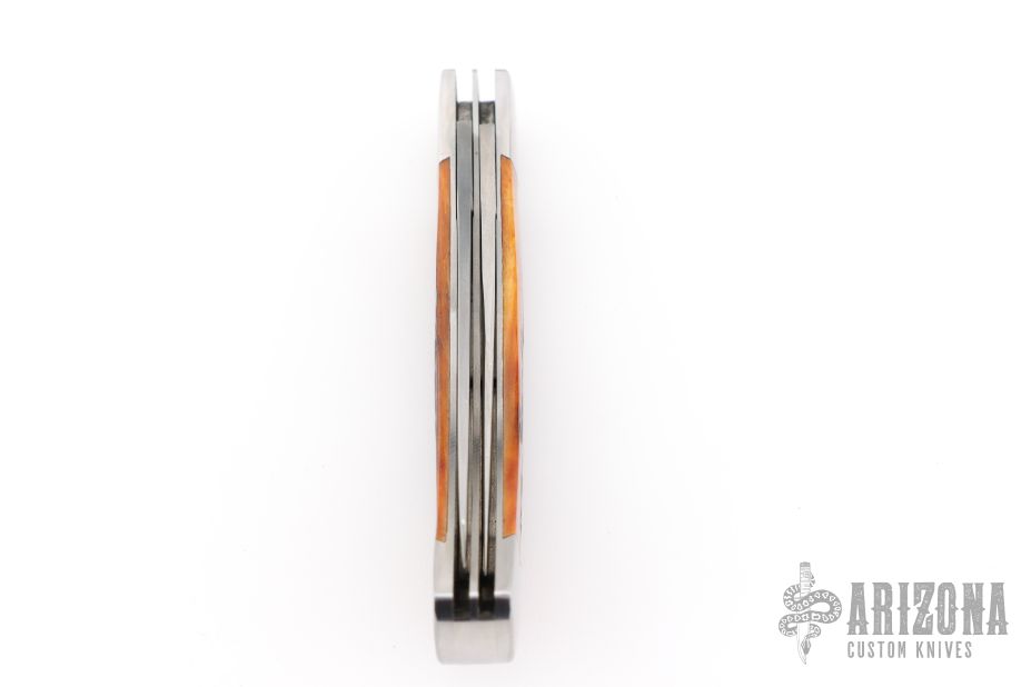 "I began making knives in 1986, beginning with the stock removal method, and started forging my blades in 1988. It wasn't long before I started forging Damascus in 1989.I primarily make sole-authorship knives, including hunters, Bowies, and folders. I especially like making folders using Damascus and Mokume, which I also make. For the appropriate knife, I'll use ATS-34. I use only high quality handle materials such as bone, pearl, and ivory. Perhaps the knives I enjoy making most are multi-blade folders, which I make in time-proven patterns including "Trapper", "Stockman", and "Sowbelly". I also make liner-lock and lock-back style folders."