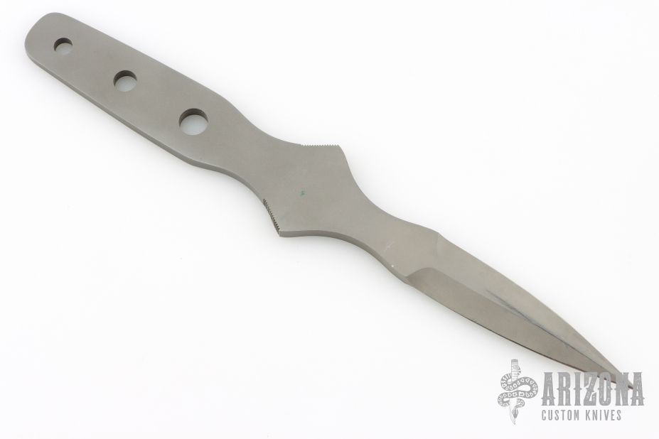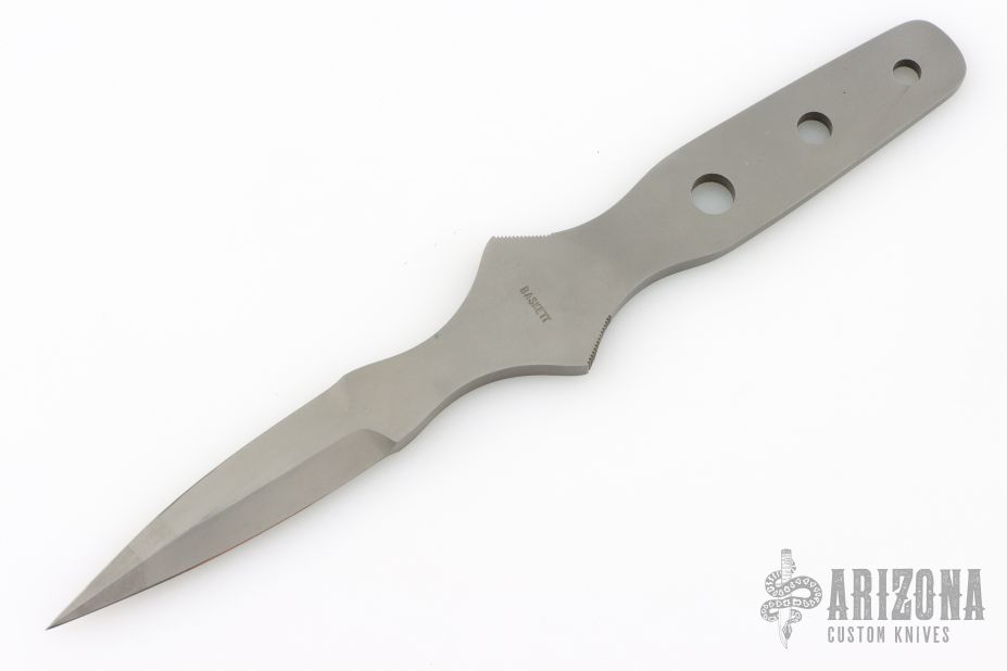 This Dagger by Gene Baskett features a bead blasted double edged blade with notched thumb and finger rests, .244" blade stock and .773" blade depth, full tang construction. Has a few light scuffs, otherwise excellent condition.