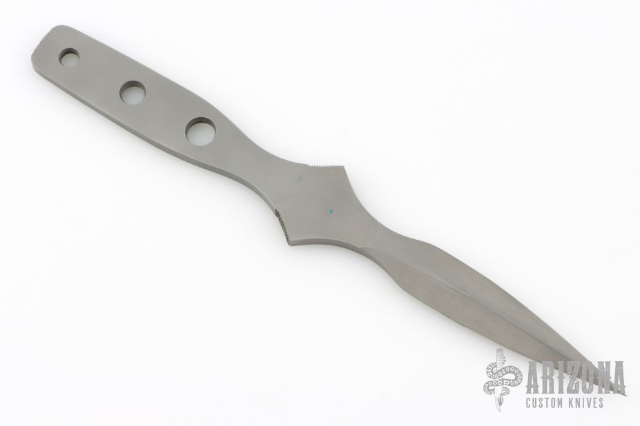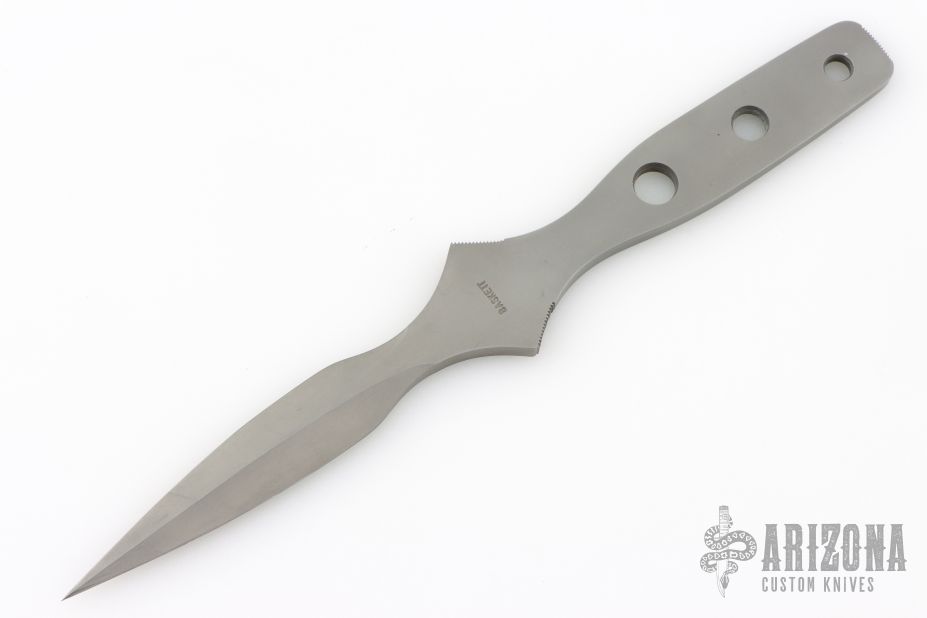 This Dagger by Gene Baskett features a bead blasted double edged blade with notched thumb and finger rests, .236" blade stock and .756" blade depth, full tang construction. Has a few light scuffs, otherwise excellent condition.