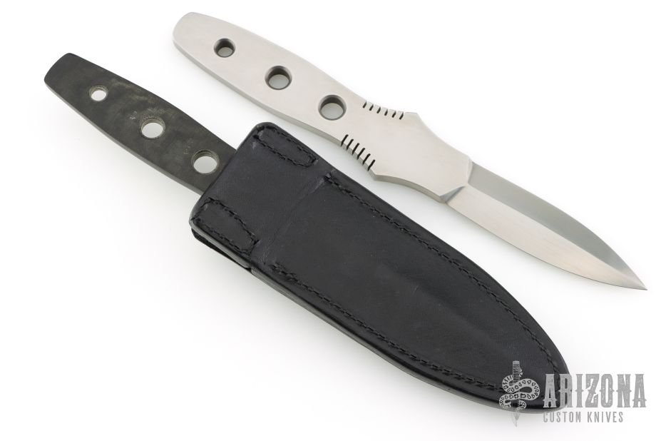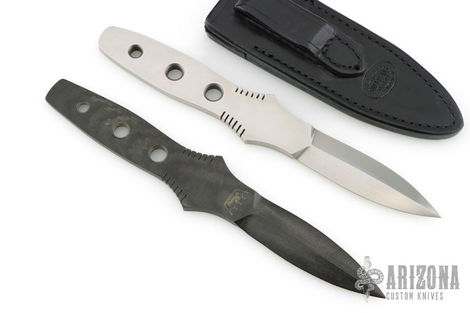 This Boot Dagger by Bill King features a hand rub satin finished double edged blade with full tang construction, .249" blade stock and .939" blade depth. Comes with a black leather sheath by Sullivan's. Comes with a matching black linen micarta dagger in the same configuration. Excellent Condition.