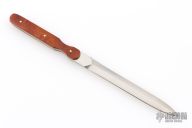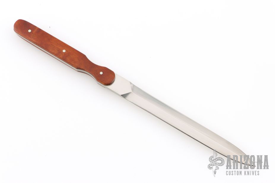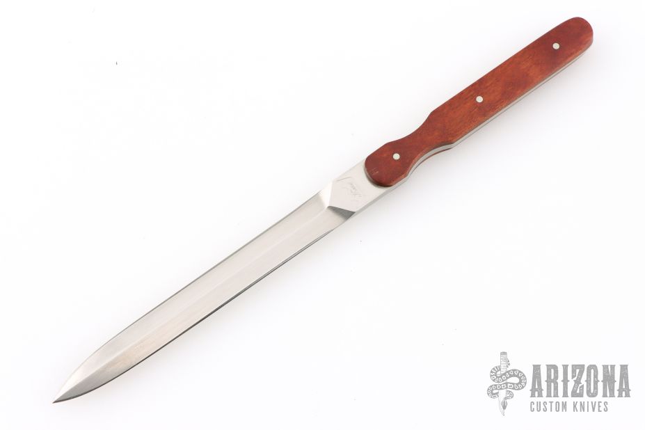 This Small Dagger by Bill King features a hand rub satin finished double edged blade with full tang construction, .125" blade stock and .402" blade depth. The handle has wood scales with nickel silver pins. Excellent Condition.