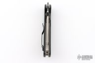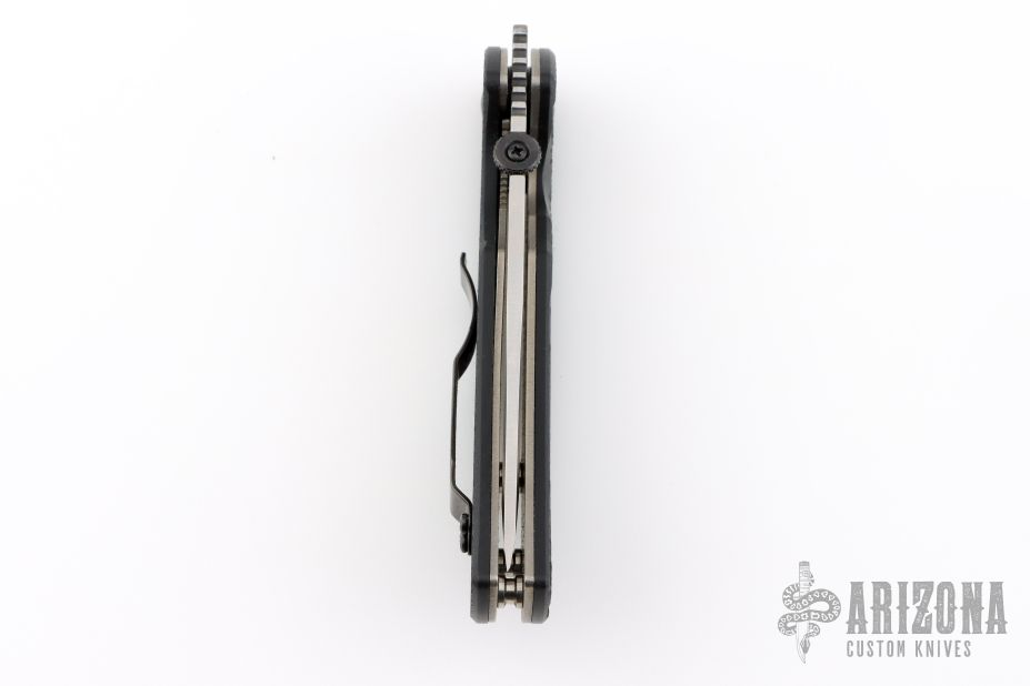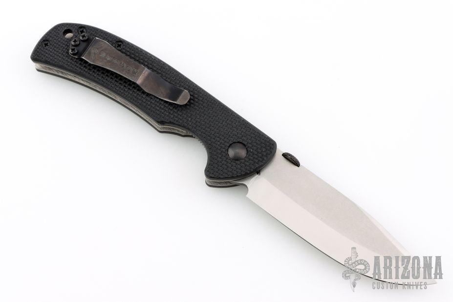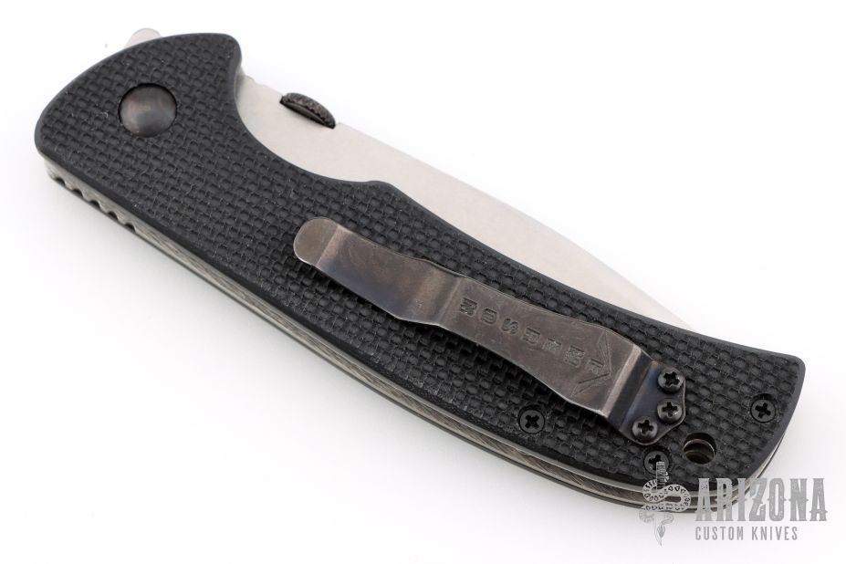 This All American linerlock by Emerson Knives has a stonewash finished blade with thumb disc, and notched thumbrest. Handle has textured black G-10 scales with titanium liners, standoffs, lanyard hole and tip up black stainless steel clip. Nice detent, lockup and blade seating. Comes with original box and papers. Excellent condition. #0131