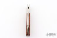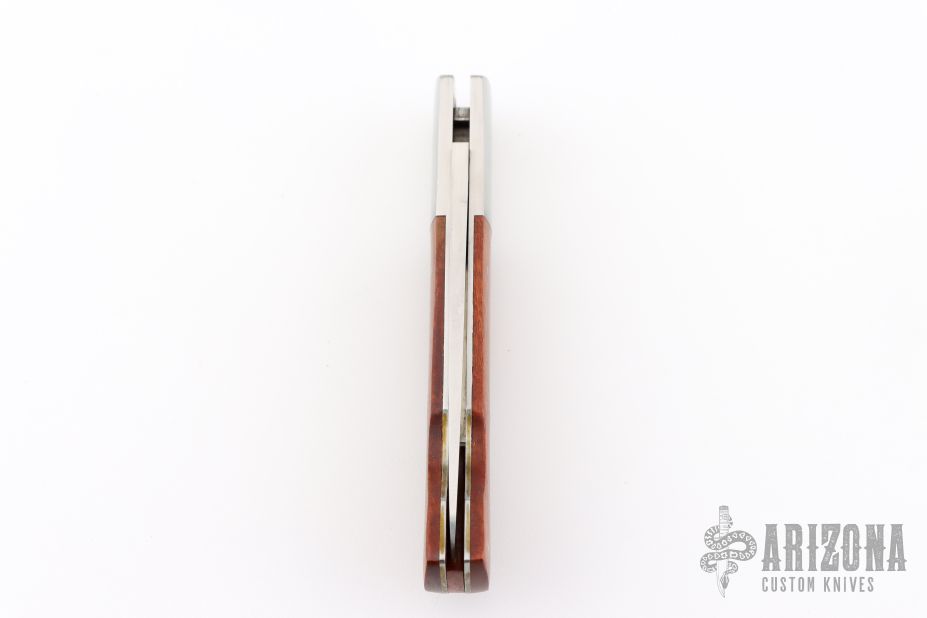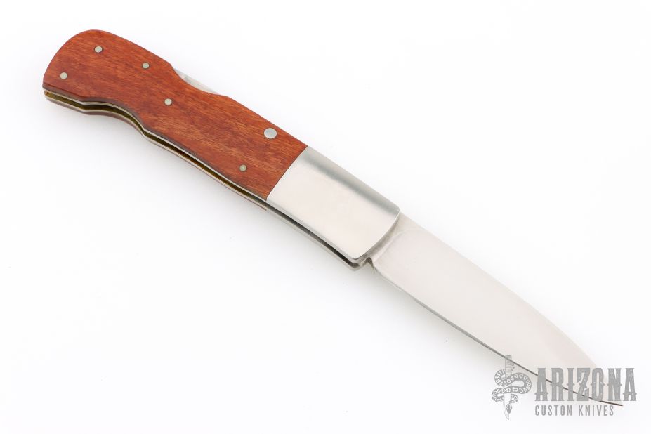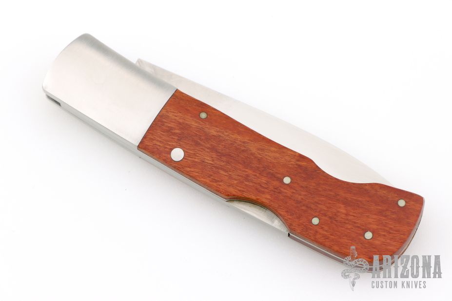 This Lockback by Bill King features a hand rub satin finished blade. The handle has stainless steel bolsters, wood scales, stainless steel liners and stainless steel lockbar and wood backspacers. Has a couple very light scratches, otherwise excellent condition.