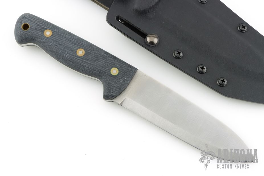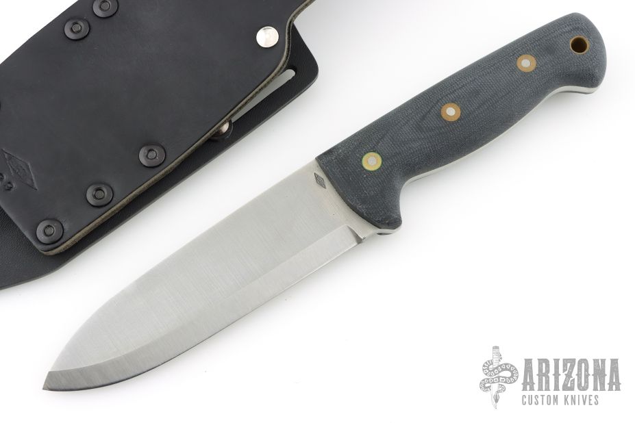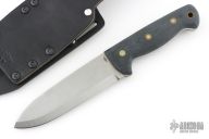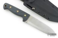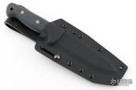 This knife by Battle Horse Knives features a scandi ground, satin finished drop point blade with .186" blade stock and 1.565" blade depth, full tang construction. The handle has black canvas micarta. Comes with a kydex sheath with leather belt loop. Has some sheath scratches, otherwise excellent condition.
