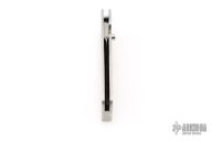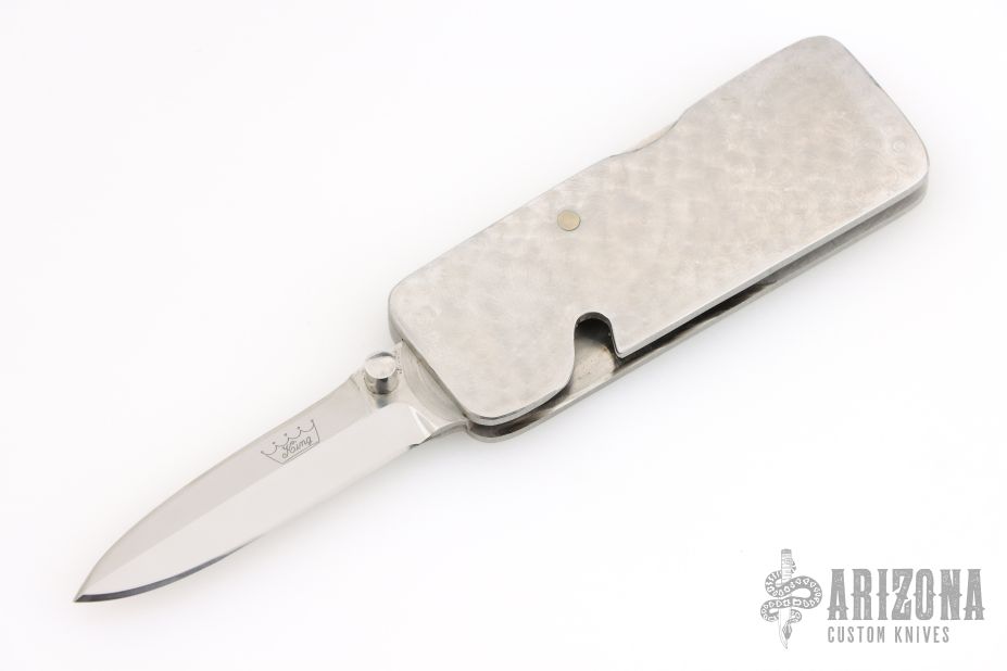 This Lockback by Bill King features a satin finished double edged blade with a single thumbstud. The handle has jeweled stainless steel scales, and a stainless steel lockbar. Has a couple light scratches, otherwise excellent condition.