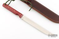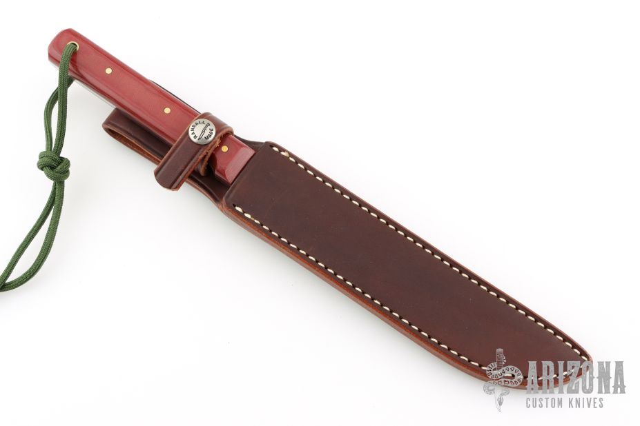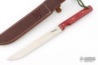 This Model 10 Salt Fisherman and Household Utility features a satin finished upswept blade with notched thumbrest, .136" blade stock and .853" blade depth. The handle has red linen micarta scales with brass pins over full tang construction. Brass lanyard tube with lanyard in pommel. Includes a brown leather sheath. Excellent condition.