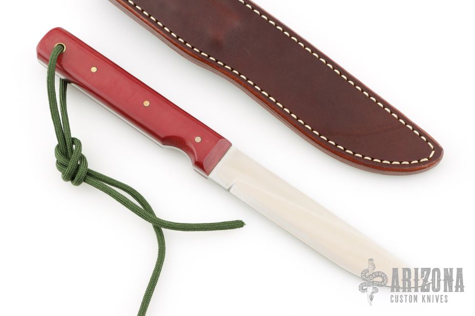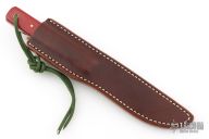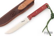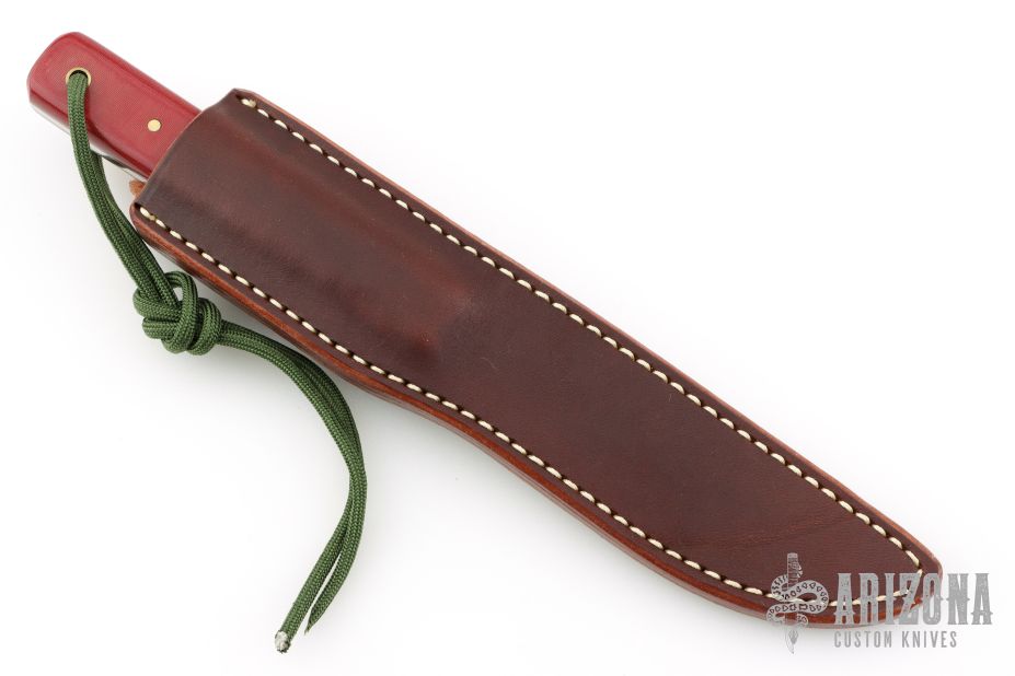 This Model 10 Salt Fisherman and Household Utility features a satin finished blade with notched thumbrest, .138" blade stock and .892" blade depth. The handle has red linen micarta scales with brass pins over full tang construction. Brass lanyard tube with lanyard in pommel. Includes a brown leather shetah. Excellent condition.