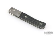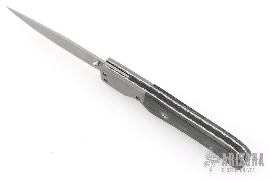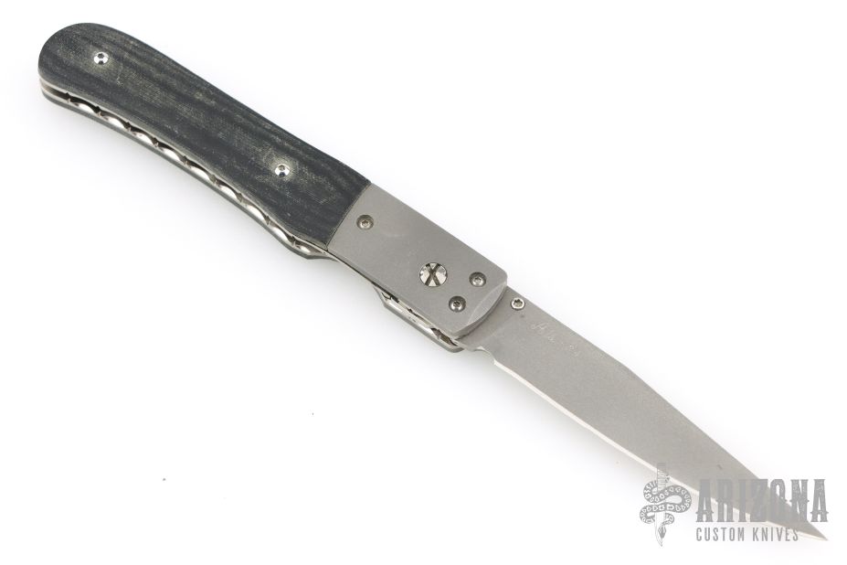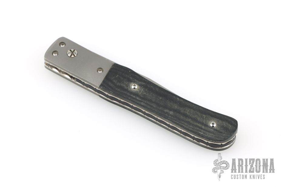 This linerlock by Bill King features a bead blast finished blade with single checkered thumbstud. The handle has bead blasted dovetailed titanium bolsters, black linen micarta scales, fileworked titanium liners and a black linen micarta backspacer. Nice detent, lockup and blade seating. Has a couple light scuffs, otherwise excellent condition.