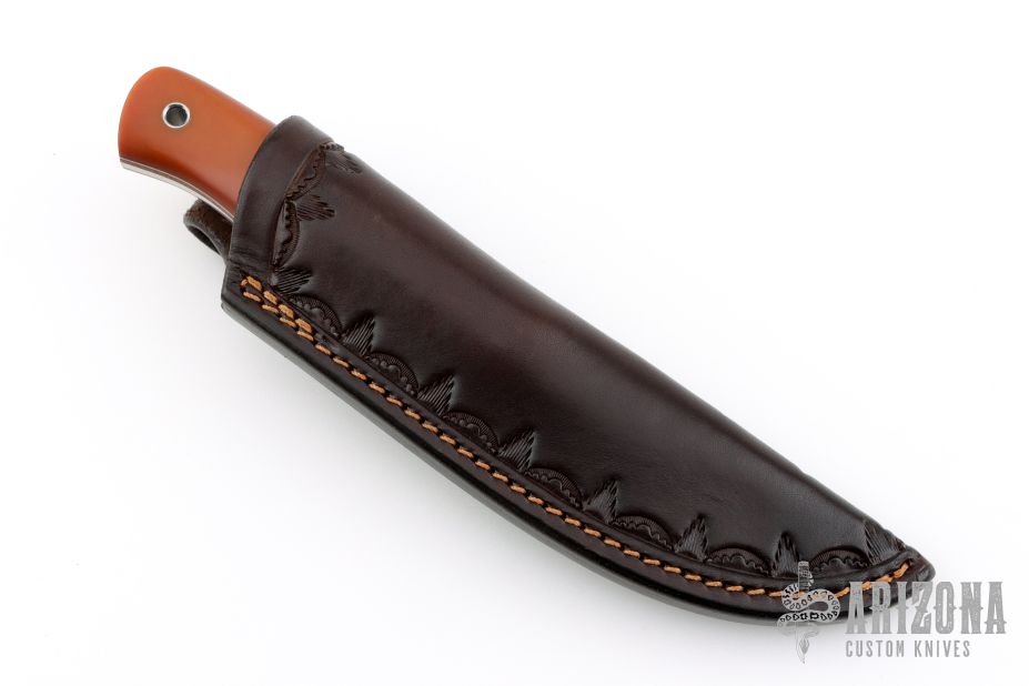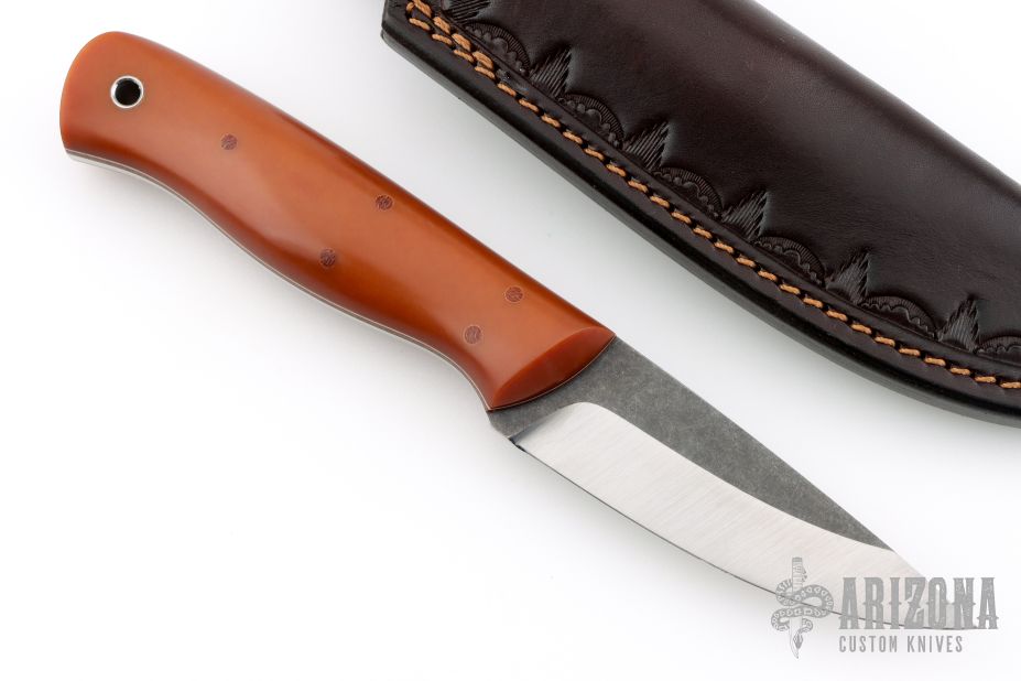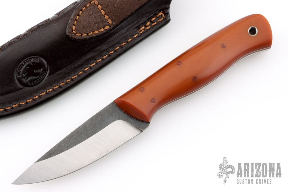 This Raptor by Warlander Enterprises features a flat ground drop point blade with stonewash flats, .108" thick blade with 1.107" blade depth, full tang construction. The handle has vintage paper micarta covers with, natural liner, thin white pinstripe, micarta pins, and stainless steel lanyard hole. Excellent fit and finish. Comes with a leather sheath, and COA. Excellent condition.