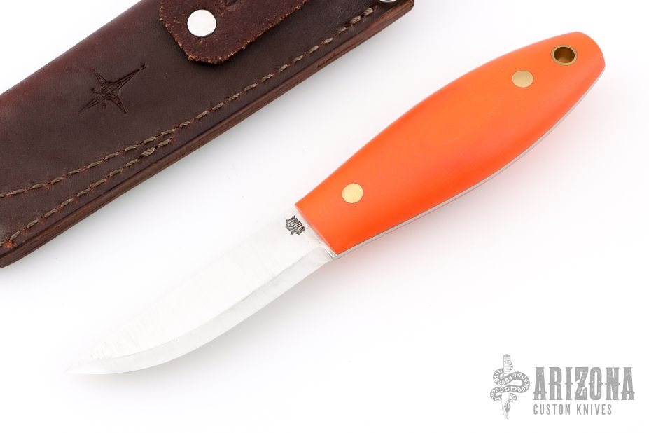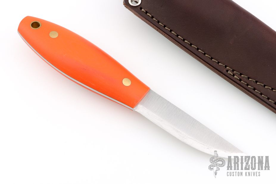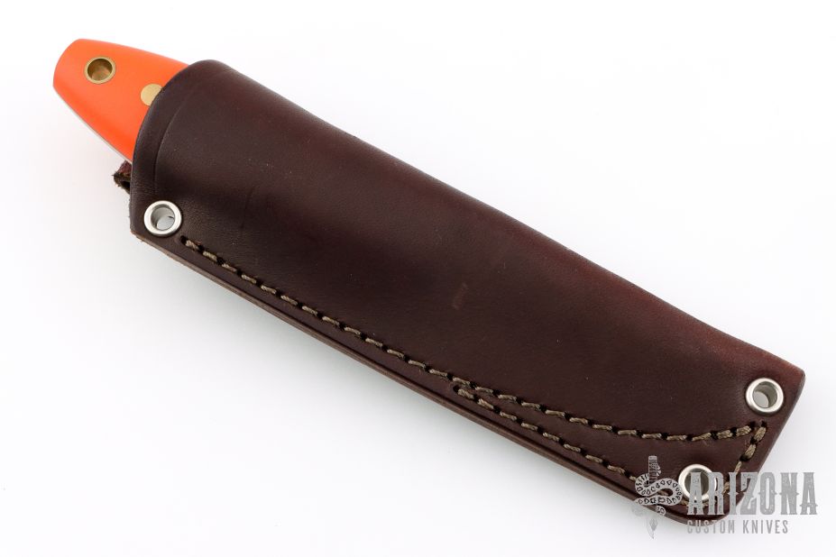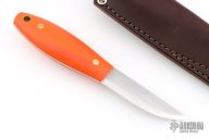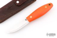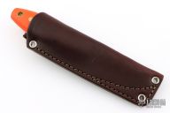 This Kamrat by LT Wright features a satin finished scandi ground blade with .089" blade stock and .88" blade depth, full tang construction. The handle has orange G-10 scales. Comes with a brown leather sheath. Has some light scratches, otherwise Excellent condition.