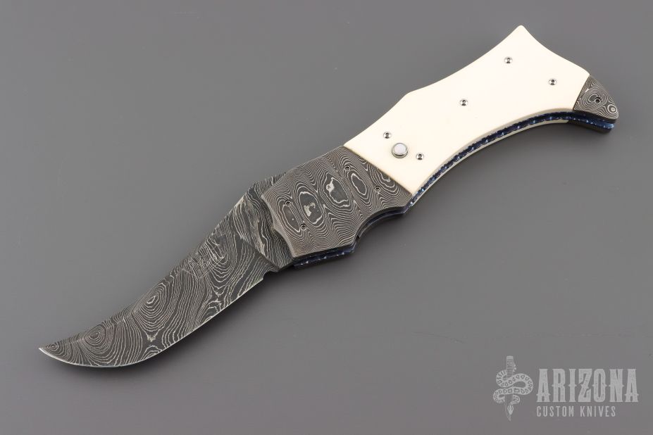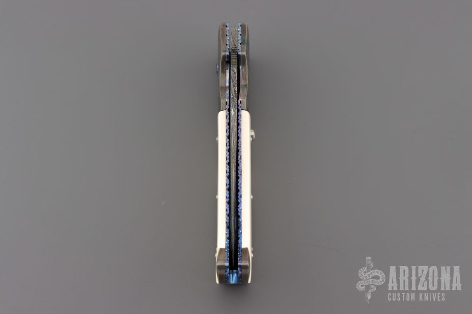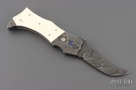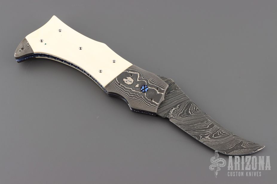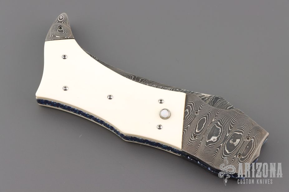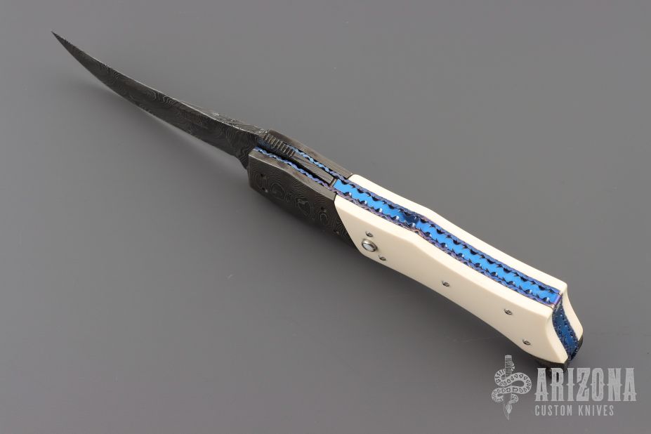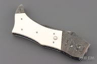 This linerlock auto from Bill King features a Damascus blade with notched thumbrest. The handle has dovetailed Damascus bolsters, opal inset push button, mammoth ivory scales, anodized and fileworked titanium liners and backspacer. Nice action, blade seating and lockup. Excellent condition. Comes with a Bill King Knives flyer.