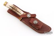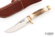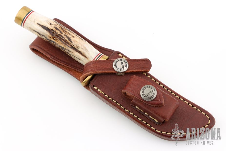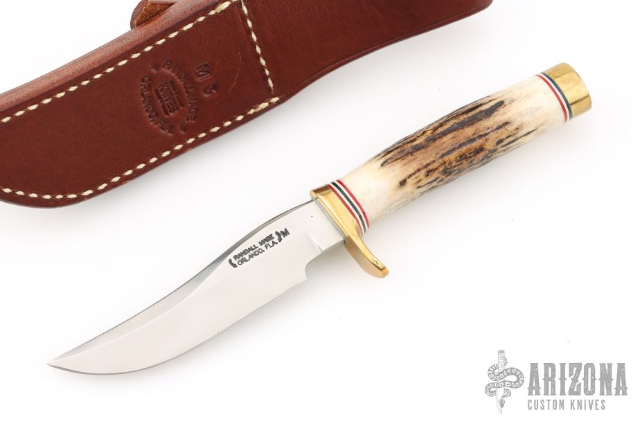 This Miniature Model 3 Hunter by Randall features a stainless steel blade with false top edge, .163" blade stock and .838" blade depth, hidden tang construction. The handle has a brass guard and butt, and stag grip with red/white/blue spacers. This knife is part of a limited edition and is numbered 1448. Comes with a brown leather sheath. Excellent condition.