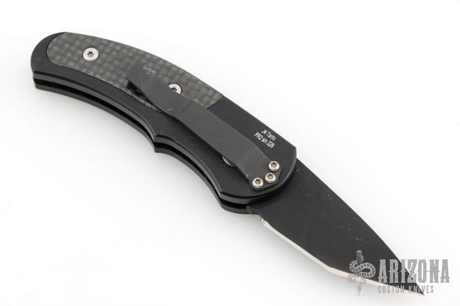 This is a Runt J4 "Jalapeno" by Pro-Tech featuring a black aluminum handle with cocobolo inlays and a stonewashed tanto blade. Coil spring. California legal. PR2 s/n 229. Has a couple light scuffs and scratches, great condition otherwise.