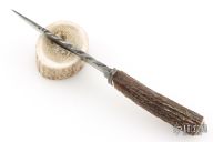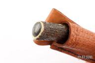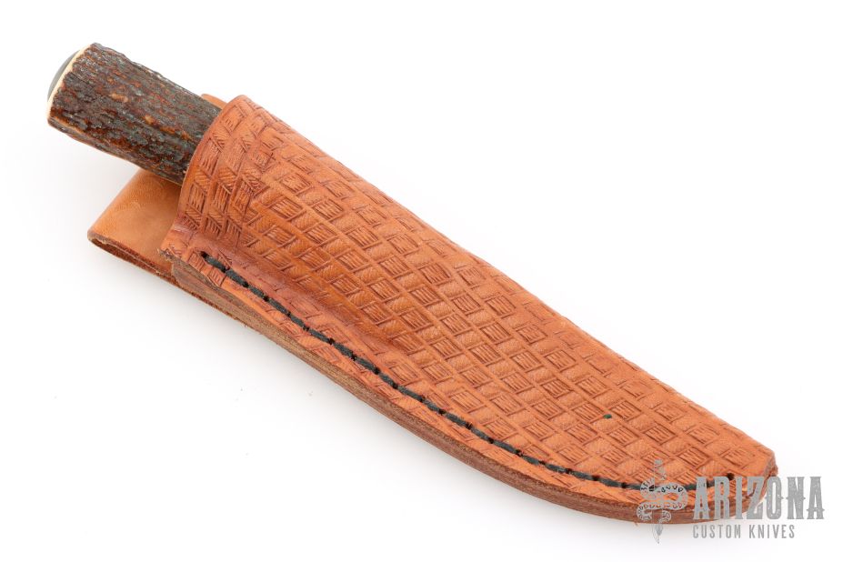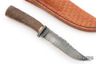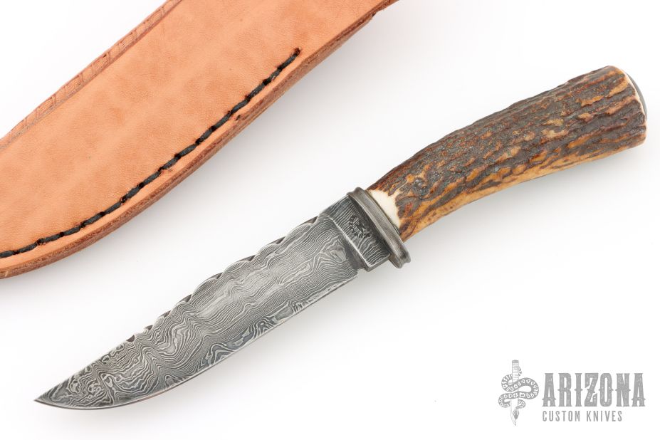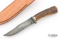 This Hunter by Master Smith Steve Schwarzer features a Damascus blade with fileworked spine, .159" blade stock and .837" blade depth, hidden tang construction. The handle has a fluted Damascus guard, stag grip with a Damascus butt. Comes with a hand tooled brown leather sheath. Excellent condition.