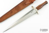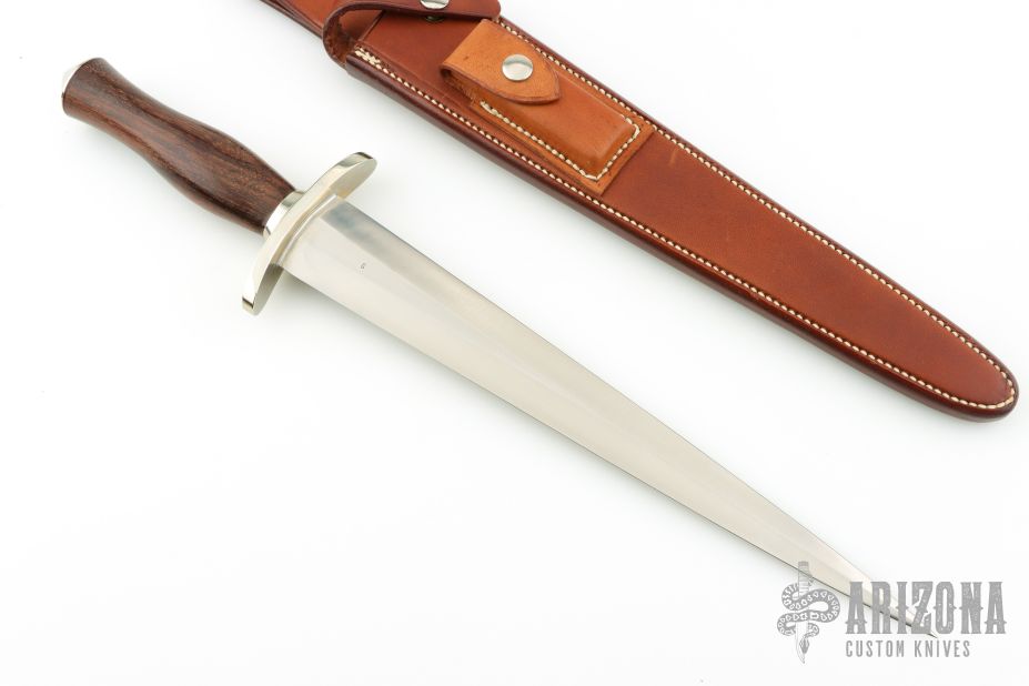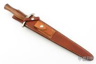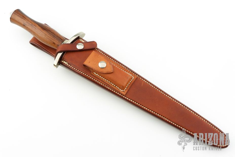 This Model 13-12 Arkansas Toothpick by Randall Made Knives features a satin finished carbon steel double edged blade with .198" blade stock and 1.624" blade depth, hidden tang construction. The handle has a forward curved nickel silver guard and coolie cap butt, walnut grip with black spacers. Comes with a rough back brown leather sheath. Has a "G" on the b-side of the blade. Excellent condition.