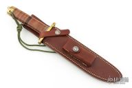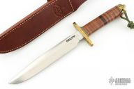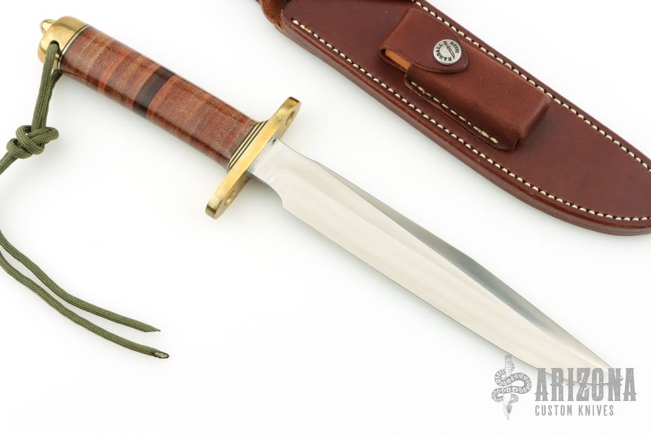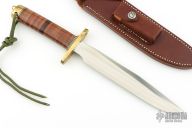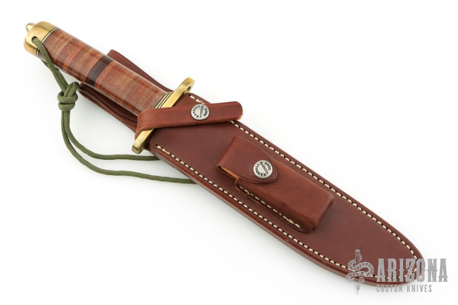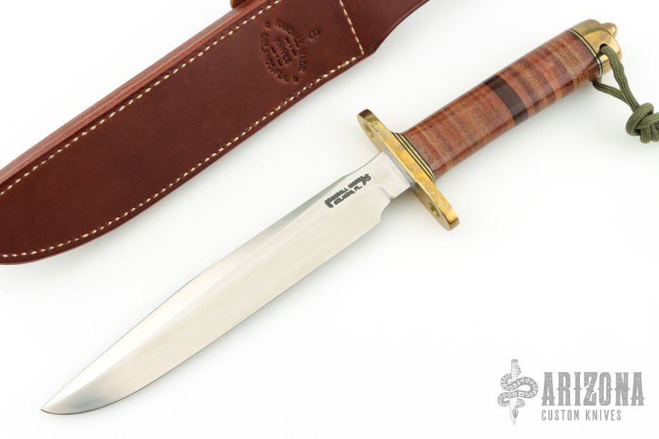 "The Model 1 by Randall Made Knives was made famous by Allied combat troops in World War II and has since been widely used in all theaters of war." This knife features a satin finished blade with a sharpened top edge, .227" blade stock and 1.204" blade depth, hidden tang construction. The handle has a Model 14 brass guard with lashing holes, stacked leather handle with black/brass spacers, and a brass butt cap with a lanyard hole. Includes a brown leather sheath. Excellent condition.